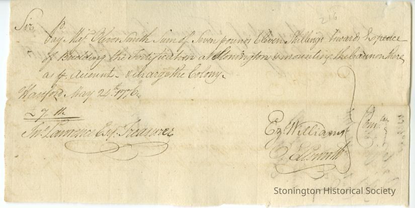 Order to State Treasurer to "pay Maj. Oliver Smith sum of Seven pounds Eleven Shillings towards Expence [sic] of Building the Fortification at Stonington & mounting the Cannon there,..."