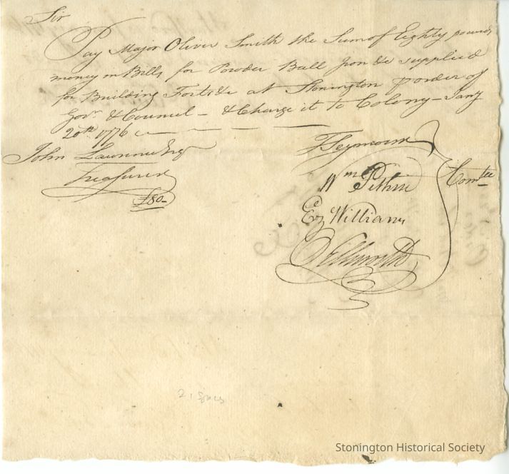 Order to State Treasurer to "pay Major Oliver Smith the sum of Eighty pounds ... for Powder Ball from the &c supplied for Building Forts at Stonington... and charge it to Colony..."