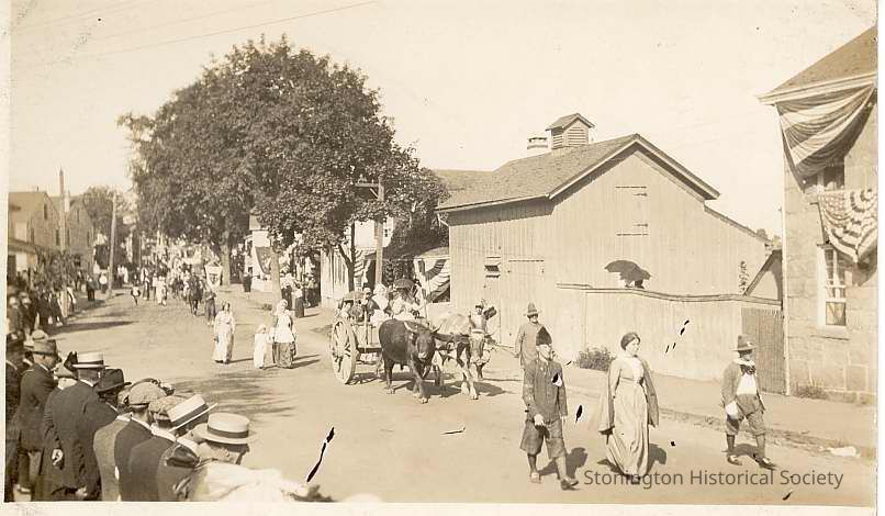 Oxen cart in parade on Elm Street during Celebration of the Battle of Stonington, 1914.