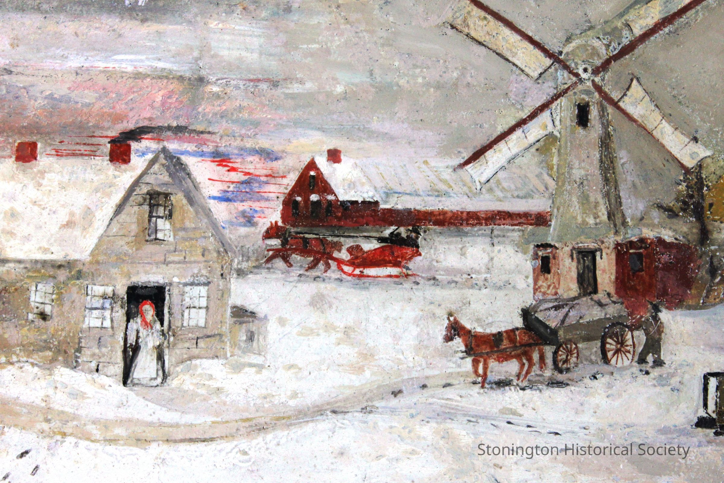 painting, on tin, winter scene-skating pond, windmill, in frame. Said to have been found in old Stanton house, Wadawanuck Square.
