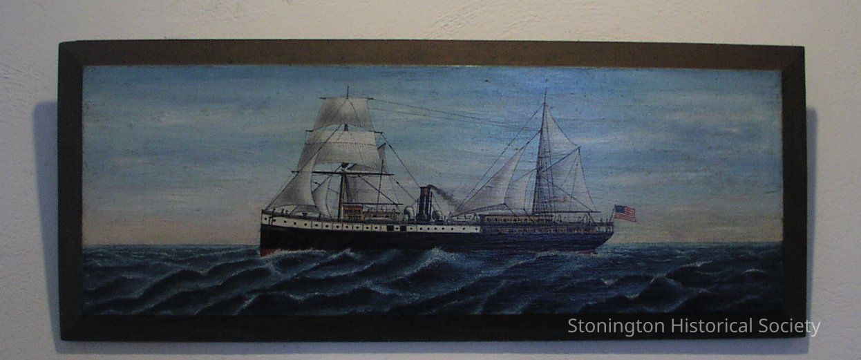Panel painting of the S.S. "City of Macon." This view depicts the port side of the vessel under sail. written on back: "Panel from south front room of 'Colonial House' built about 1700 by John Whiting. Bought 1829 by Capt. Franklin Noyes, Stonington, Conn. Now owned by his son Nathaniel Pendleton Noyes. [Probably the work of donor's brother, CEP Noyes, Lighthouse keeper 1869-72). Presented to Historical Society Nov. 3, 1922."