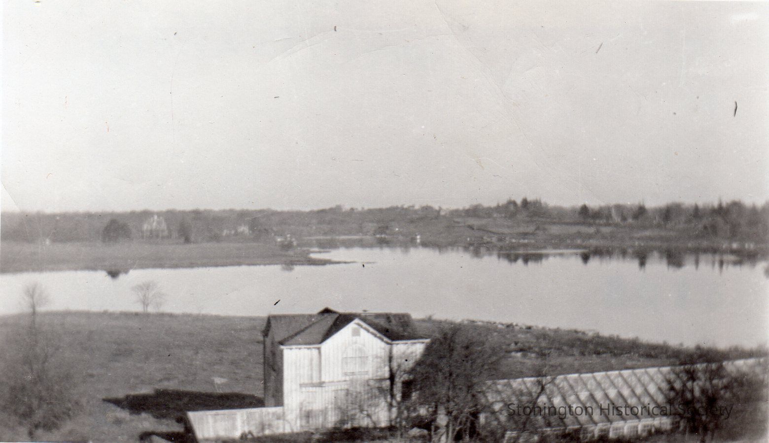 Black and white snapshot of the Palmer barn and grapery, photographed from the Capt. Nathaniel Palmer House looking north across Quanaduck Cove. Belonged to Henry R. Palmer, Jr.