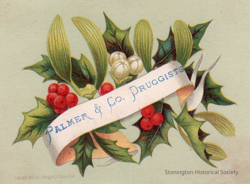 Trade Card, "Palmer & Co., Druggists, Stonington, CT" Palmer & Co. operated at 151 Water Street in Stonington Borough. Published by L. Prang & Co., Boston, 1878.