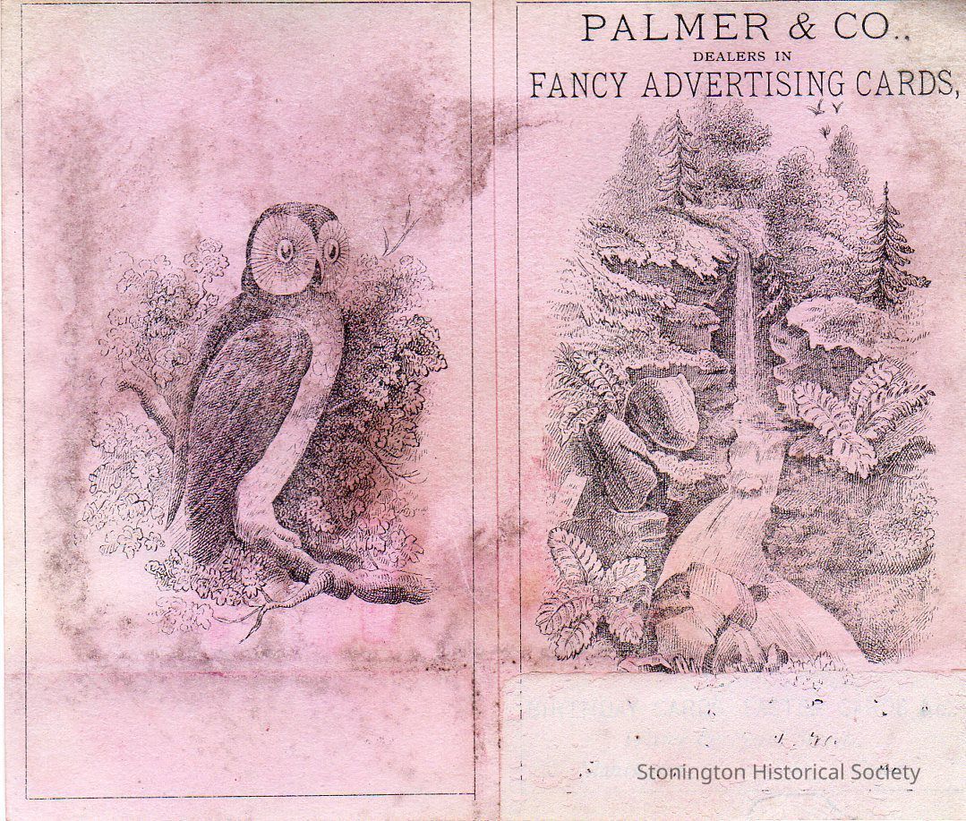 Trade Card, "Palmer & Co., Dealers in Fancy Advertising Cards, Birthday Cards, Easter Cards &c, Water & Pearl Sts., Stonington, Conn." Palmer & Co. operated at 151 Water Street in Stonington Borough.