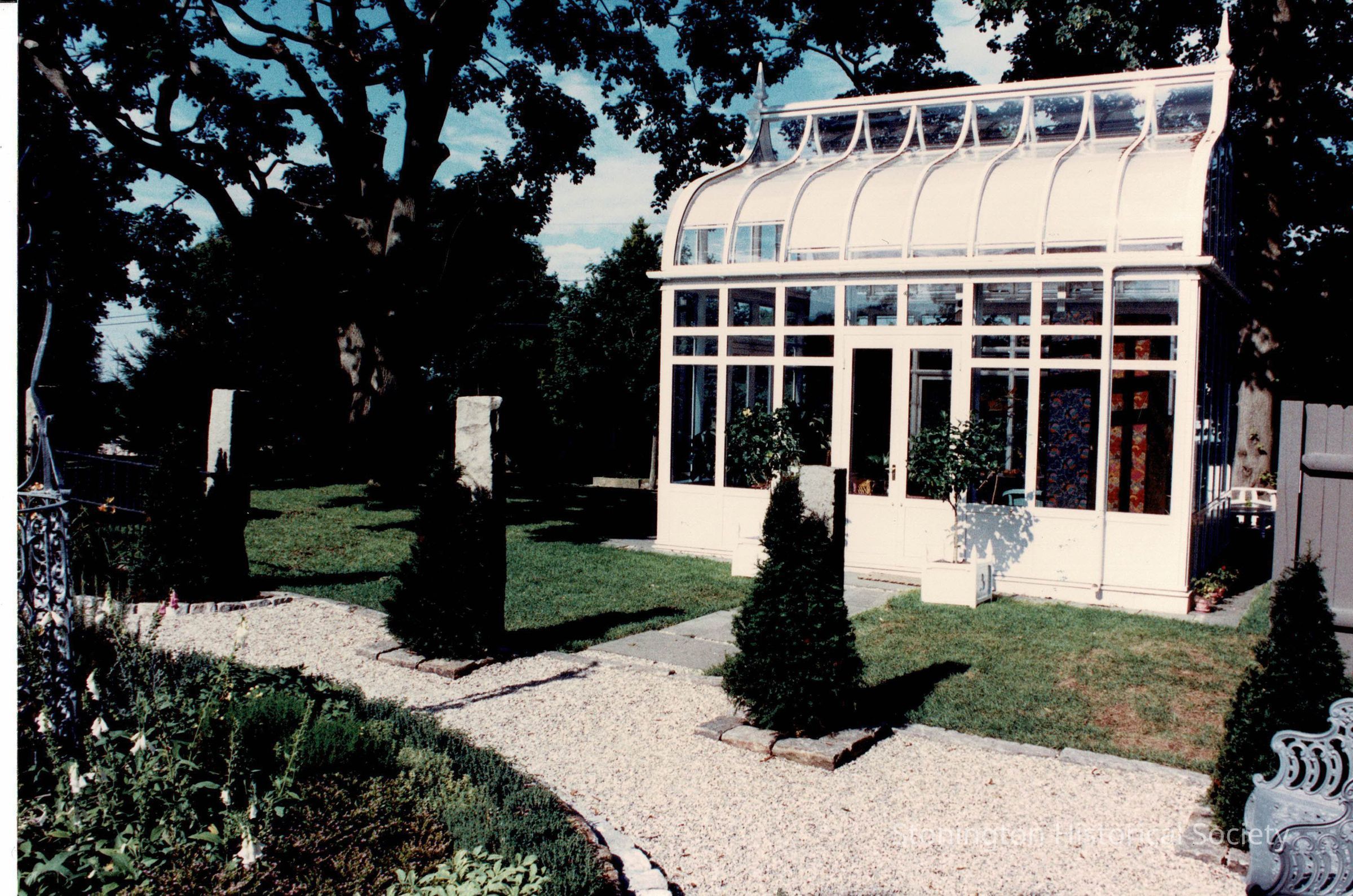 View of “A Summer Place”, as it was for the Designer’s Show House in 1989. A Summer Place was designed by Arnold Copper and William Strohm of Madison Avenue, NY. It was placed on the west side of the service yard, and removed after the Designer's Showhouse. This view shows a bit of the landscaping of the service yard, which at the time had been transformed into an herb garden.Collection