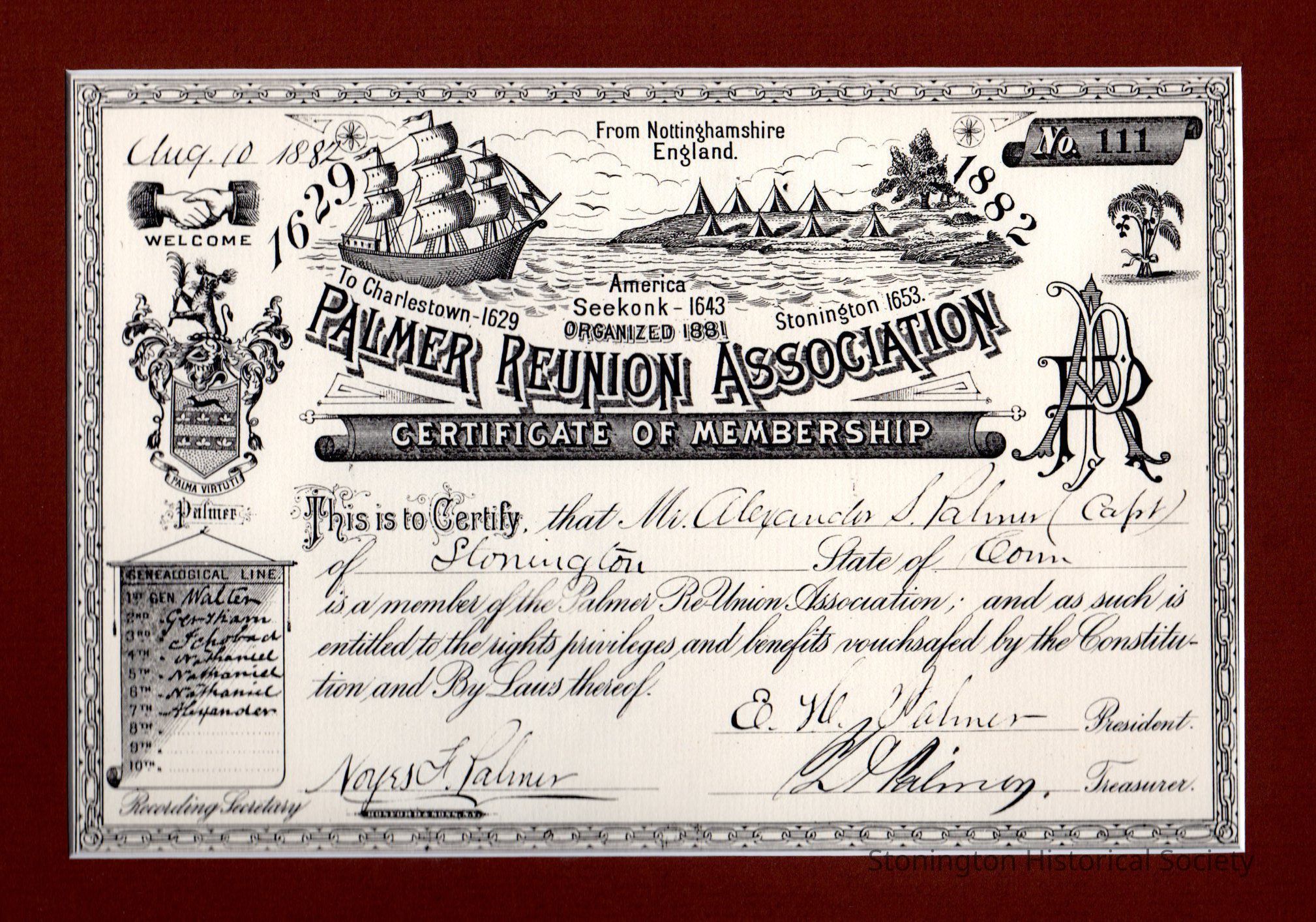 Copy of Certificate, "Certificate of Membership, Palmer Reunion Association, 1629-1882, Mr. Alexander S. Palmer (Capt), August 10, 1882"Collection
