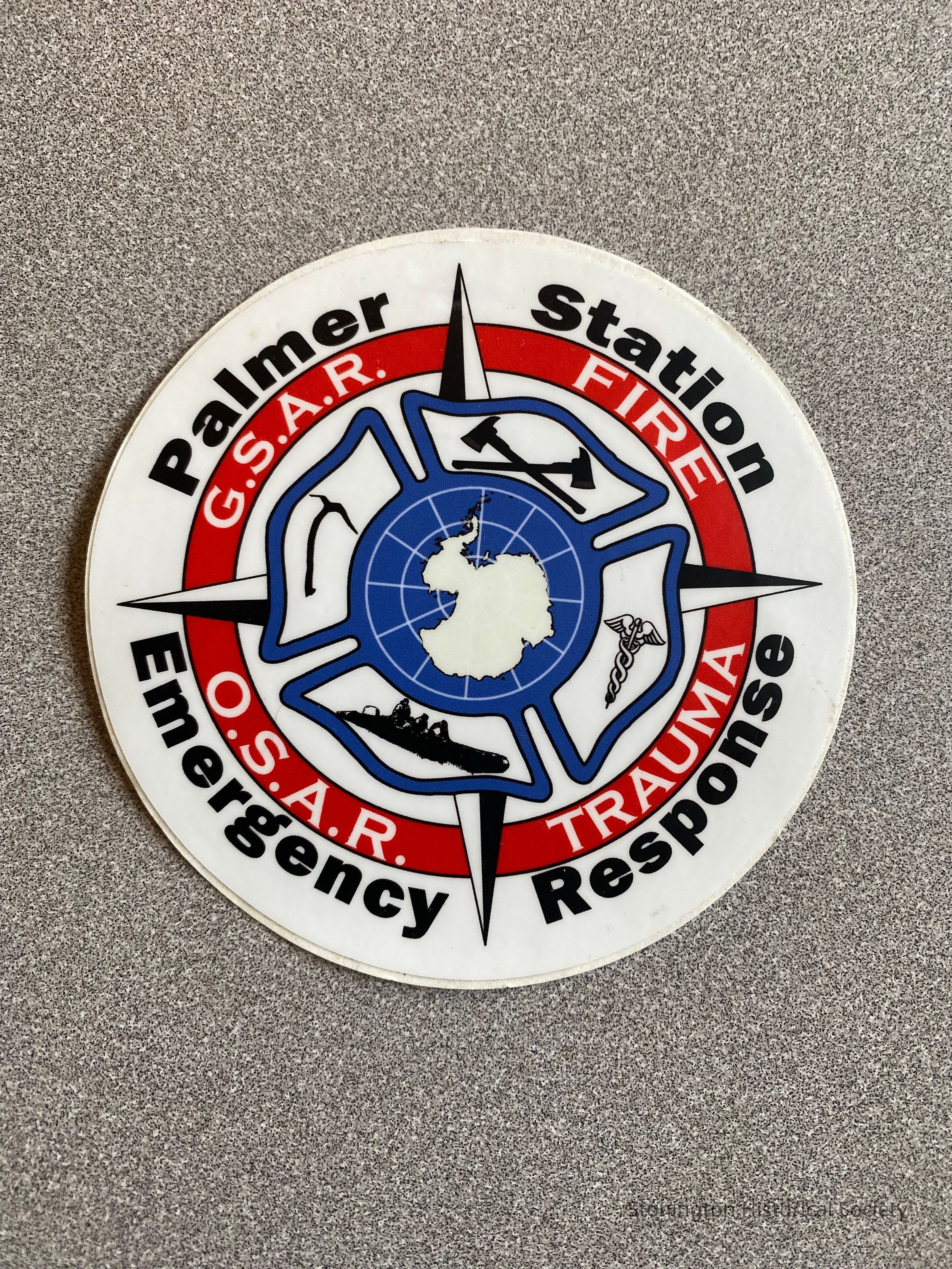 Palmer Station Emergency Response Team bumper sticker. In Antarctica, emergency response involves a team of personnel who are trained to handle various situations like medical emergencies, fires, and search and rescue operations. All staff members typically participate in one or more emergency response teams depending on their skills and the situation. Palmer Station maintains communication with other nearby research stations in Antarctica to coordinate emergency response if necessary.Collection