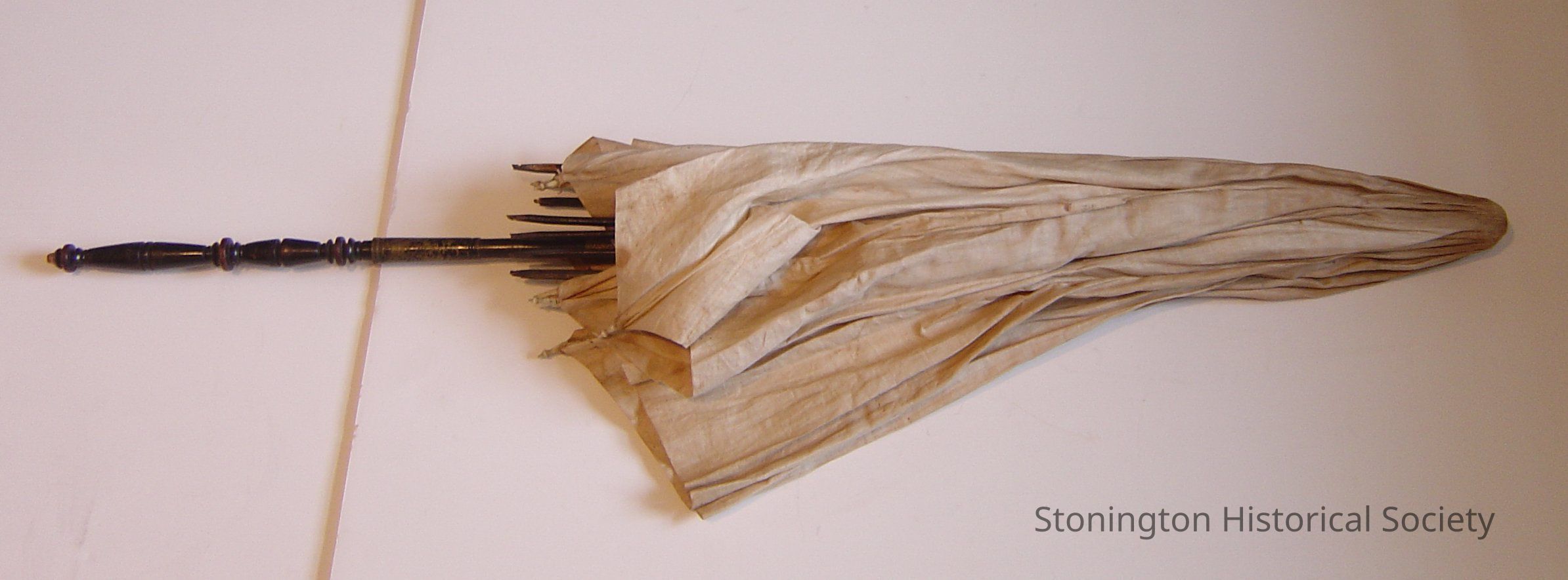 cloth parasol with ornate, hinged handle and baleen stays