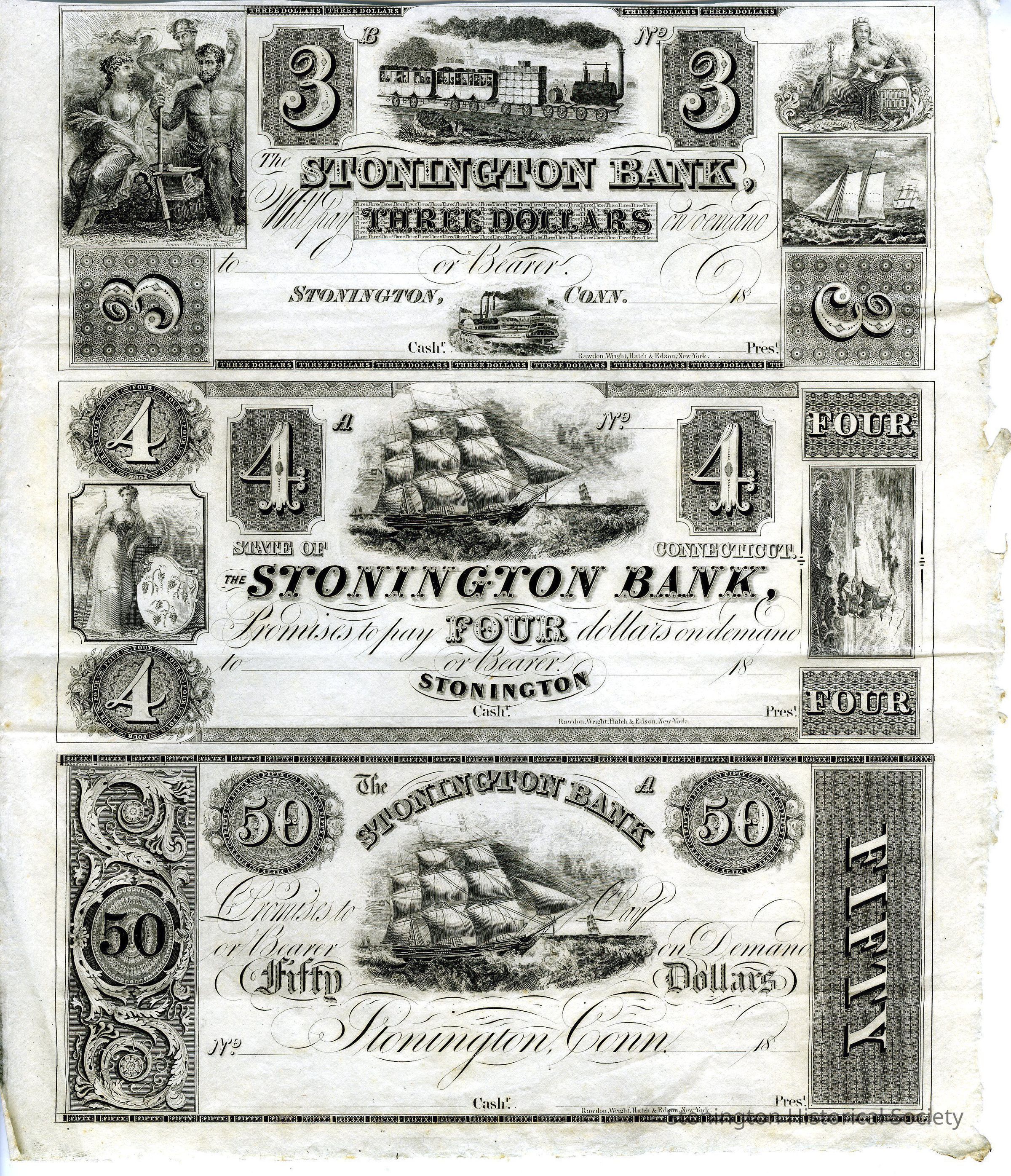 Partial sheet of bank notes from Stonington Bank $3.00, $4.00, and $50.00Entry/Object ID