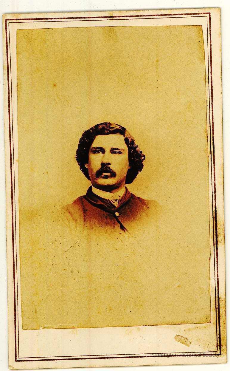 Head and shoulders portrait of young man with mustache "respectfully yours, Paul S. Noyes, Serg. Co K 14 Conn"