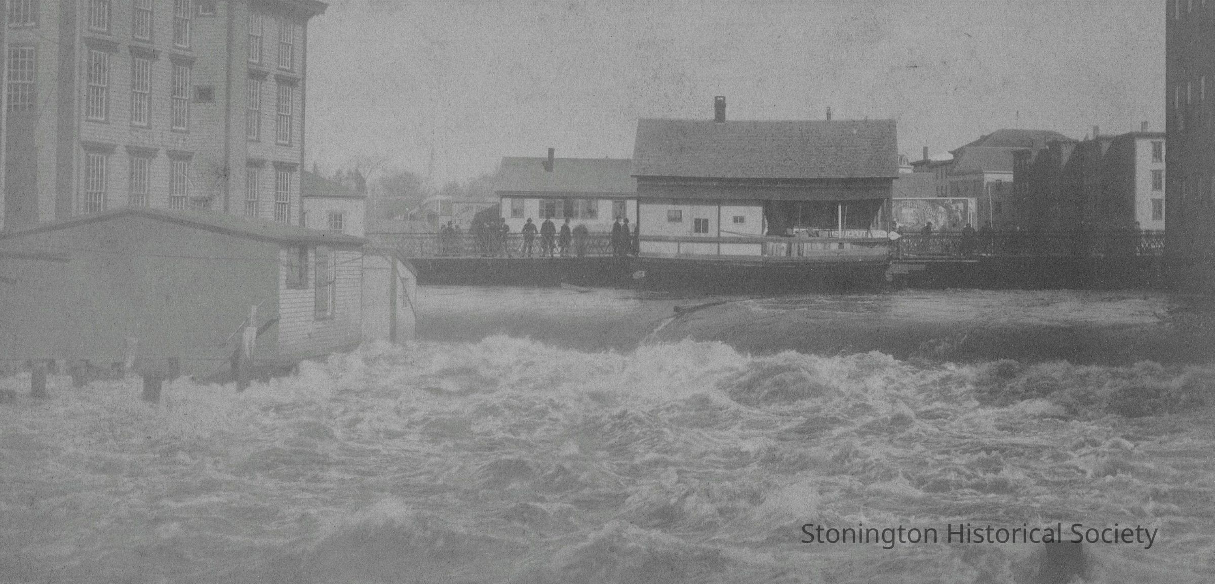 View of the raging Pawcatuck River below the dam after the flood in February 1886. Westerly/Pawcatuck bridge.Made/Created
