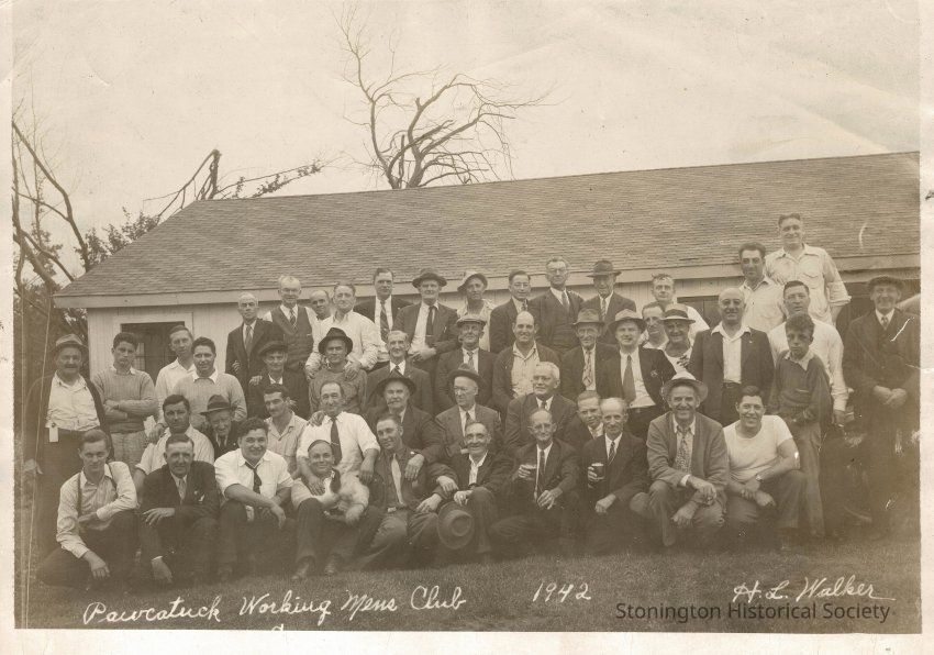 Photograph taken 1942 by H.L. Walker outside the Pawcatuck Working Mens Club. Most of the men appear middle aged, but a few are quite young or very old. None of the men in the photograph are identified.Collection