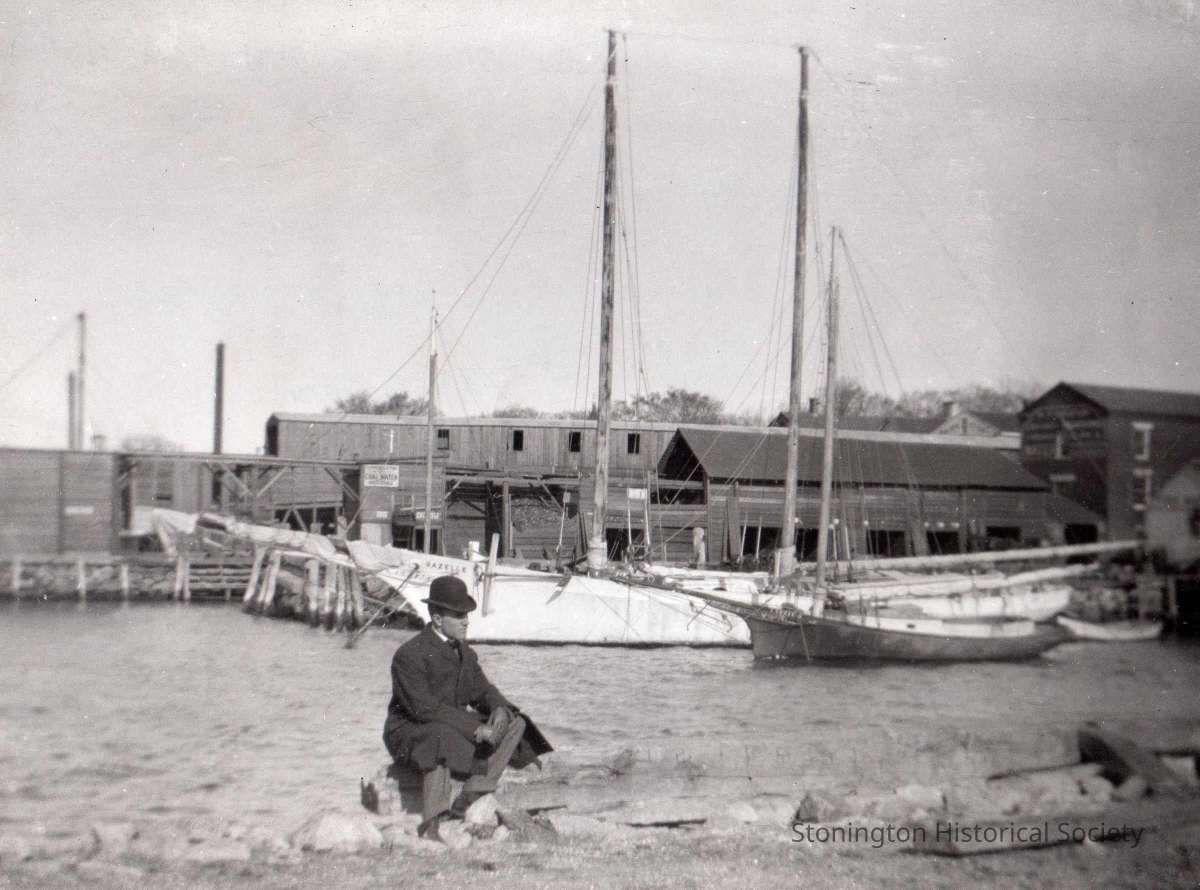 Black and white photograph of the Pendleton Coal Sheds, Stonington Borough, 1904. Label on back reads: "Uncle Harry poses (probably on a Sunday afternoon in early Spring, judging by the fancy clothes and the angle of the sun) on a pier that no longer exists. In background are Sam Pendleton's coal sheds (now Bindloss' dock) and in extreme right center is the brick building that grandfather John F. Trumbull built. Schooner GAZELLE and sloop LIZZIE lie alongside." Photo belonged to Henry R. Palmer, Jr. ["Uncle Harry is Harry Babcock?]