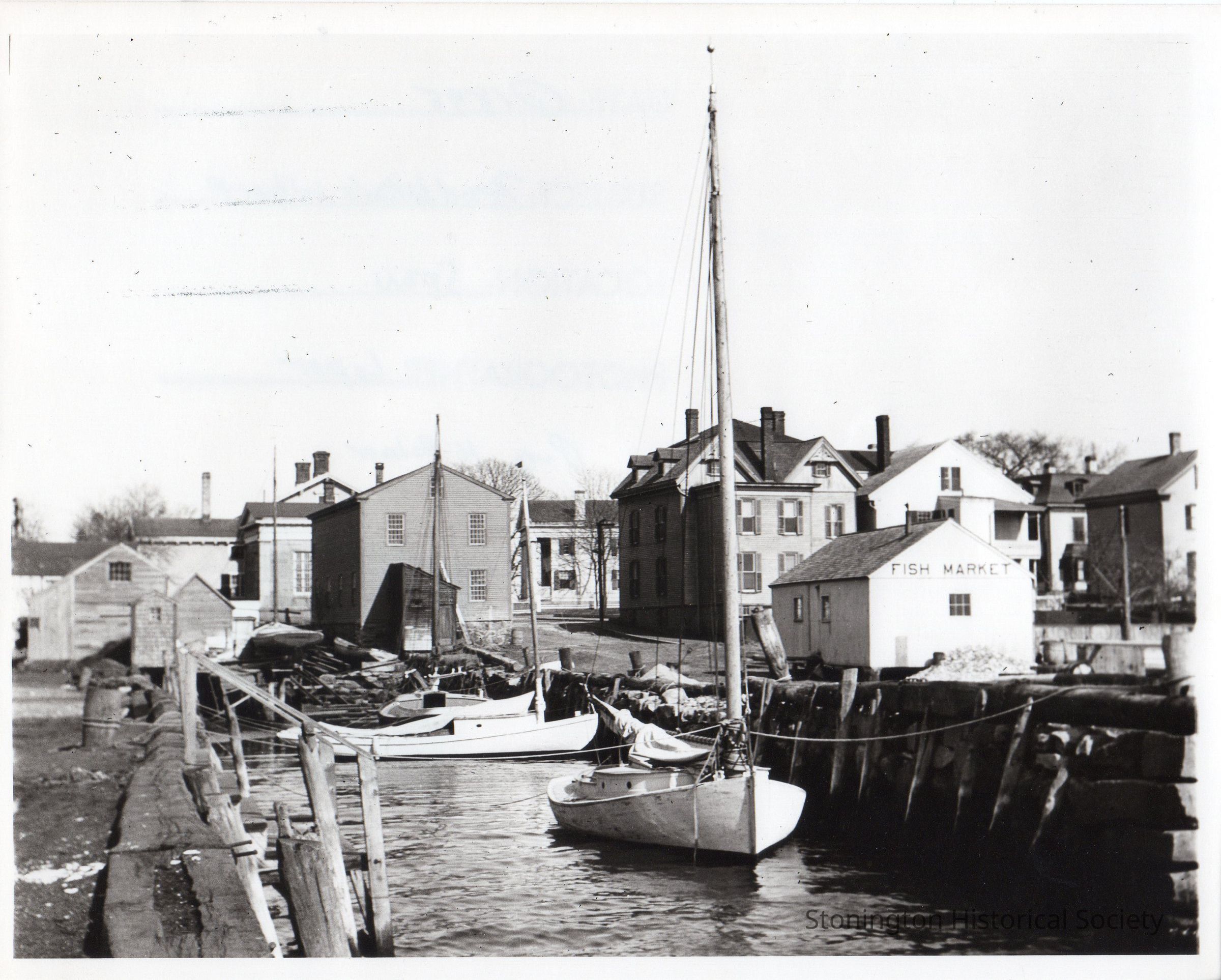 Black and white photograph of Pendleton's Wharf, seen from Stonington Harbor looking towards Cannon Square, c. 1895. Photo belonged to Henry R. Palmer, Jr.