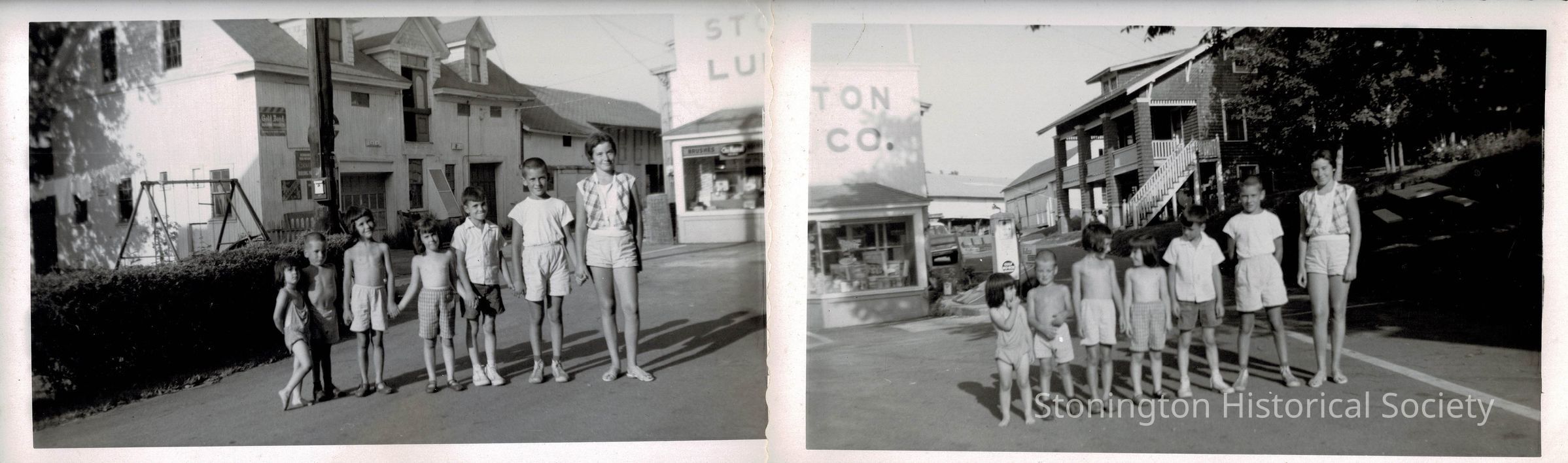 Two photographs showing the Perry and Miner cousins as children in front of Stonington Lumber Company in October 1959. These are the children of Andrew and Midge Perry, and Martha and Reginald Miner. Andrew Perry and Martha Miner were brother and sister. Children are roughly identified by their ages.