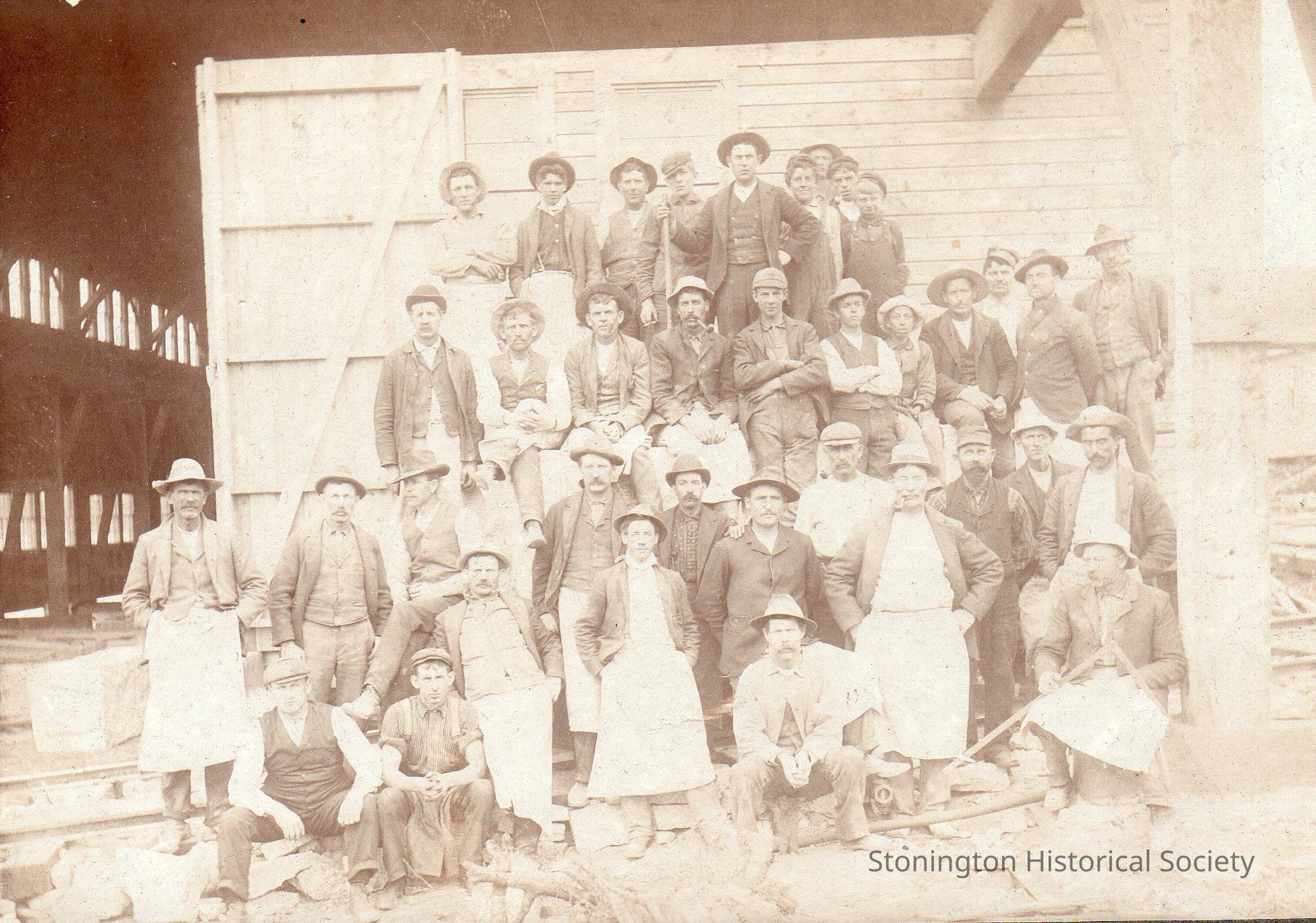 Photograph, group of employees posed along the railroad tracks. Written on back in pencil: "Will Jamesson (?), Stonington, 1905."