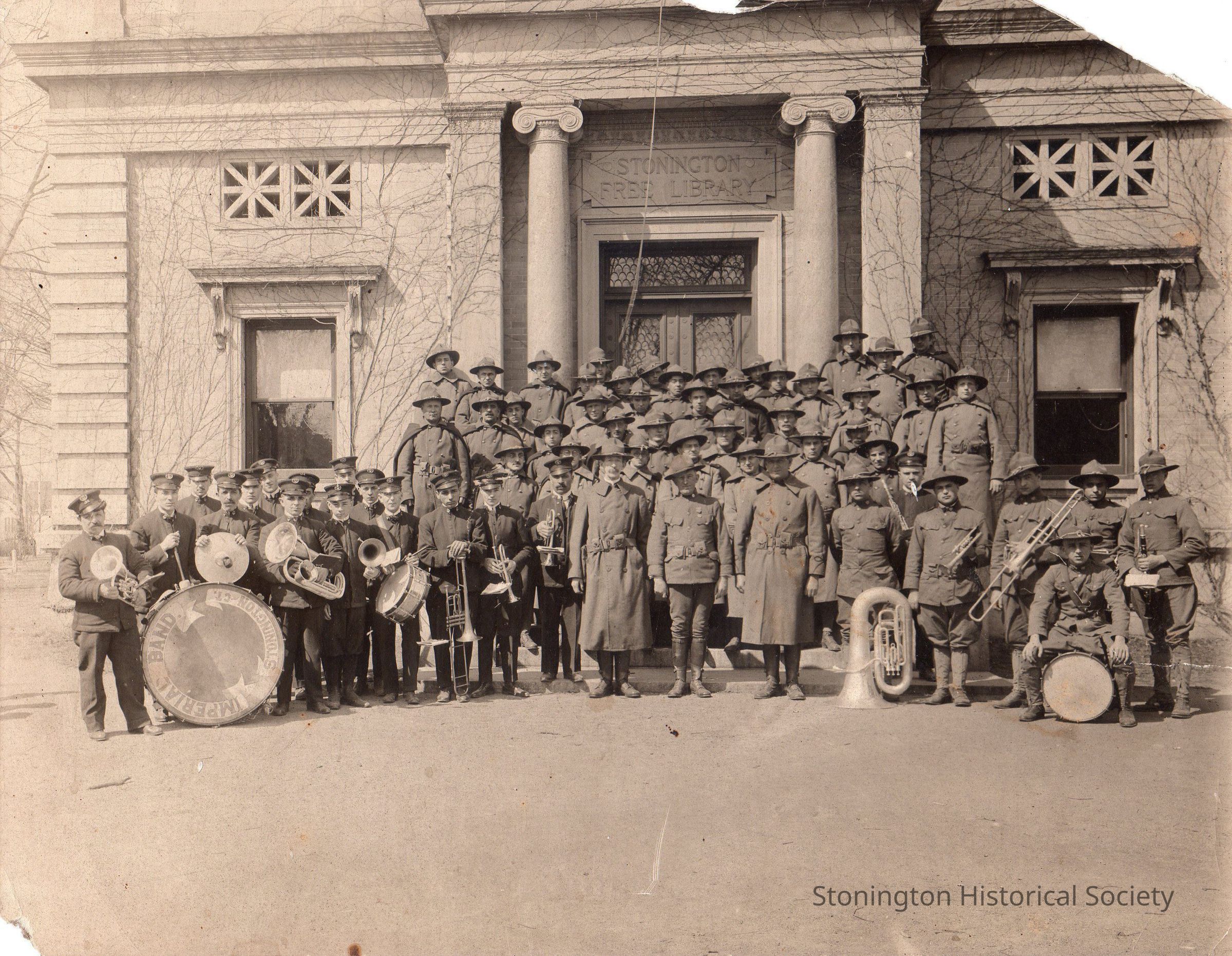 Photograph, the Stonington Imperial Band assembled in front of the Stonington Free Library, early 1900s.