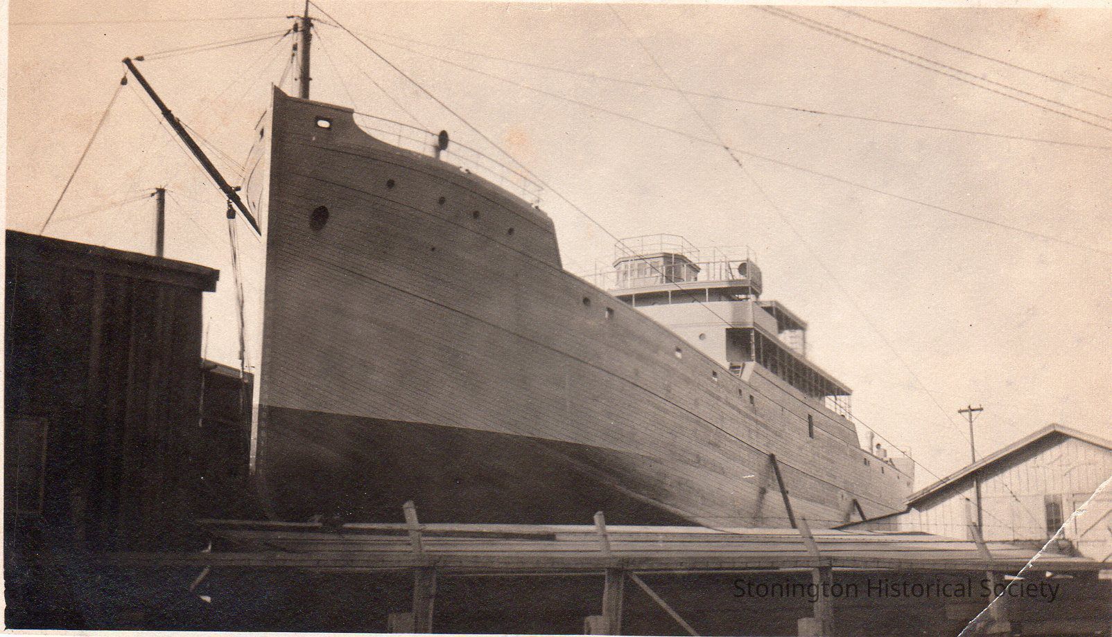 Black and white photograph, the ASHLAND or ALTURA nearing completion at the Ship Construction & Trading, Inc. in Stonington, March 1919. The vessels were large Ferris-type steamships ordered by the US Shipping Board Emergency Fleet Corporation for WWI.