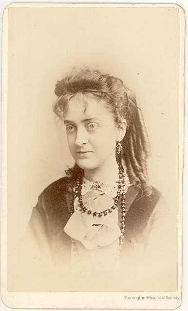 Head and shoulders photo of unidentified young woman with cork screw curls, necklace, brooch