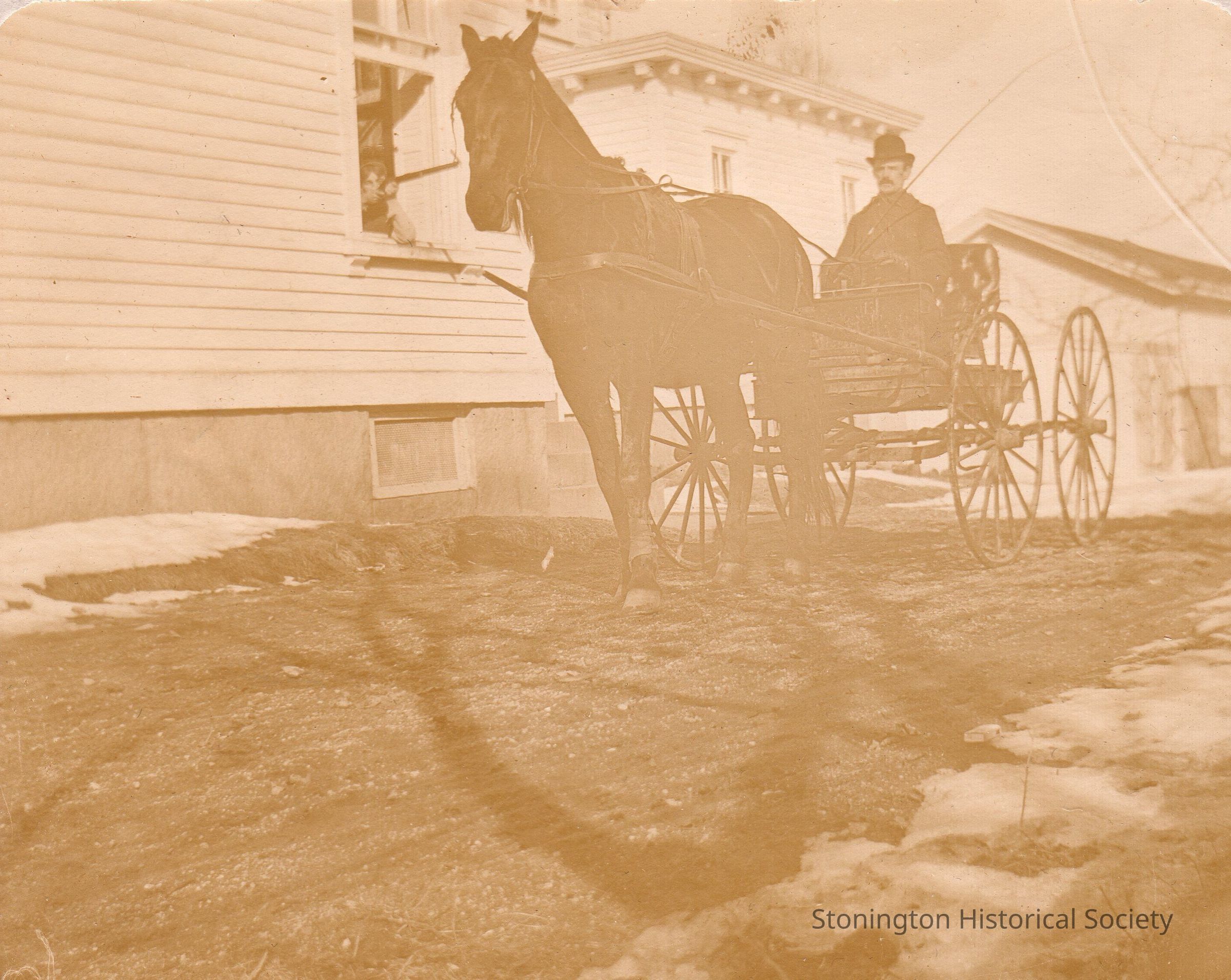 Photograph from the Alexander Palmer Loper Photograph album, c. 1898. Donald Stanton in a horse and carriage at Pine Point (the Capt. Nathaniel Palmer House, 40 Palmer Street).Collection