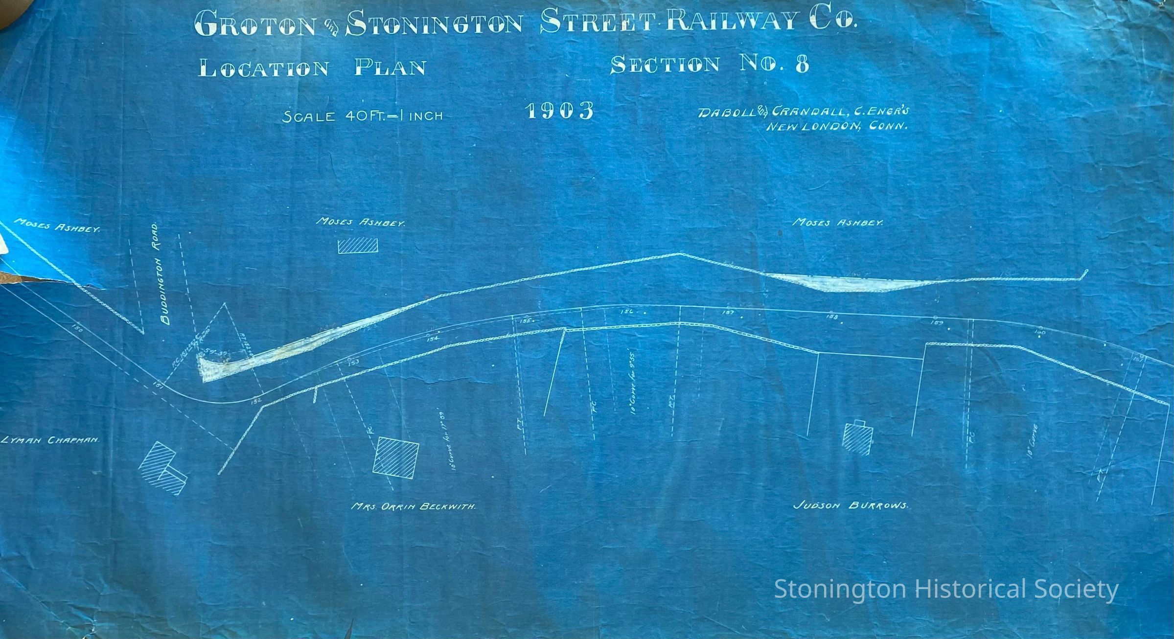 Collection of 4 plans outlining the proposed location of the "Groton and Stonington Street Railway Co." completed by Daboll & Crandall of New London, Conn., 1903. Locations in Groton, Noank and Stonington (Palmer's Cove); shows the properties of Moses Ashbey, Lyman Chapman, Mrs. Orrin Beckwith, Judson Burrows, Frank Fitch, Levi Lamb, Edward Woodmansee, Addie & Alice Spicer, Rosa Fitch, George Wilbur, Mrs. Lyman Chester, Charles Randall, Stuart Chrisholm, William, Spicer, Ernest Palmer, Fred Fitch, Augustine Chester, Henry Tryon, Albert Fitch, Elisa Fitch, and Thomas Collins.Collection