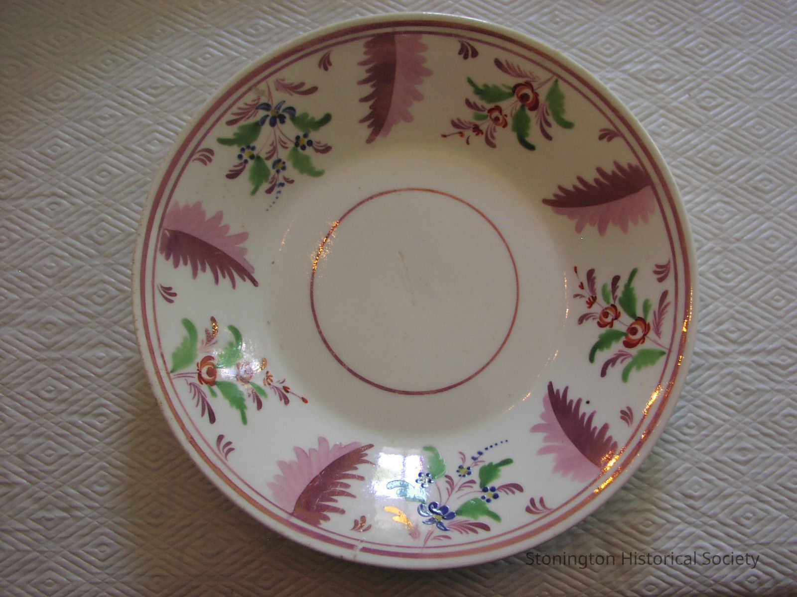 Lusterware cake plate, 1 of 7 pieces, pink-copper with flowers.