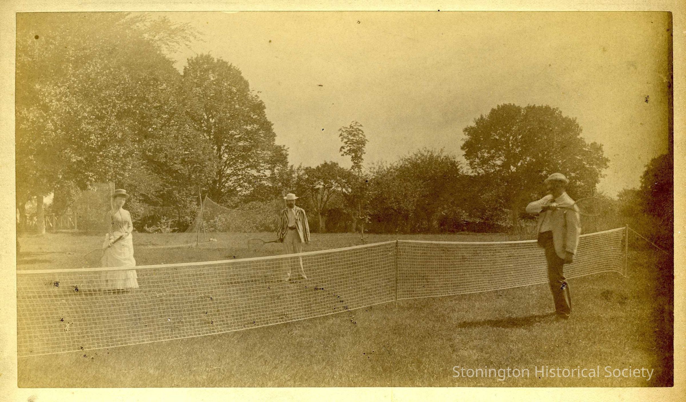 A photograph of three people standing on a lawn tennis court. One woman in a light colored dress, a man in a striped jacket, and an older man with a cigarette are holding rackets and looking at the camera. The entry bridge to Stone Acres is visible on the left.Collection