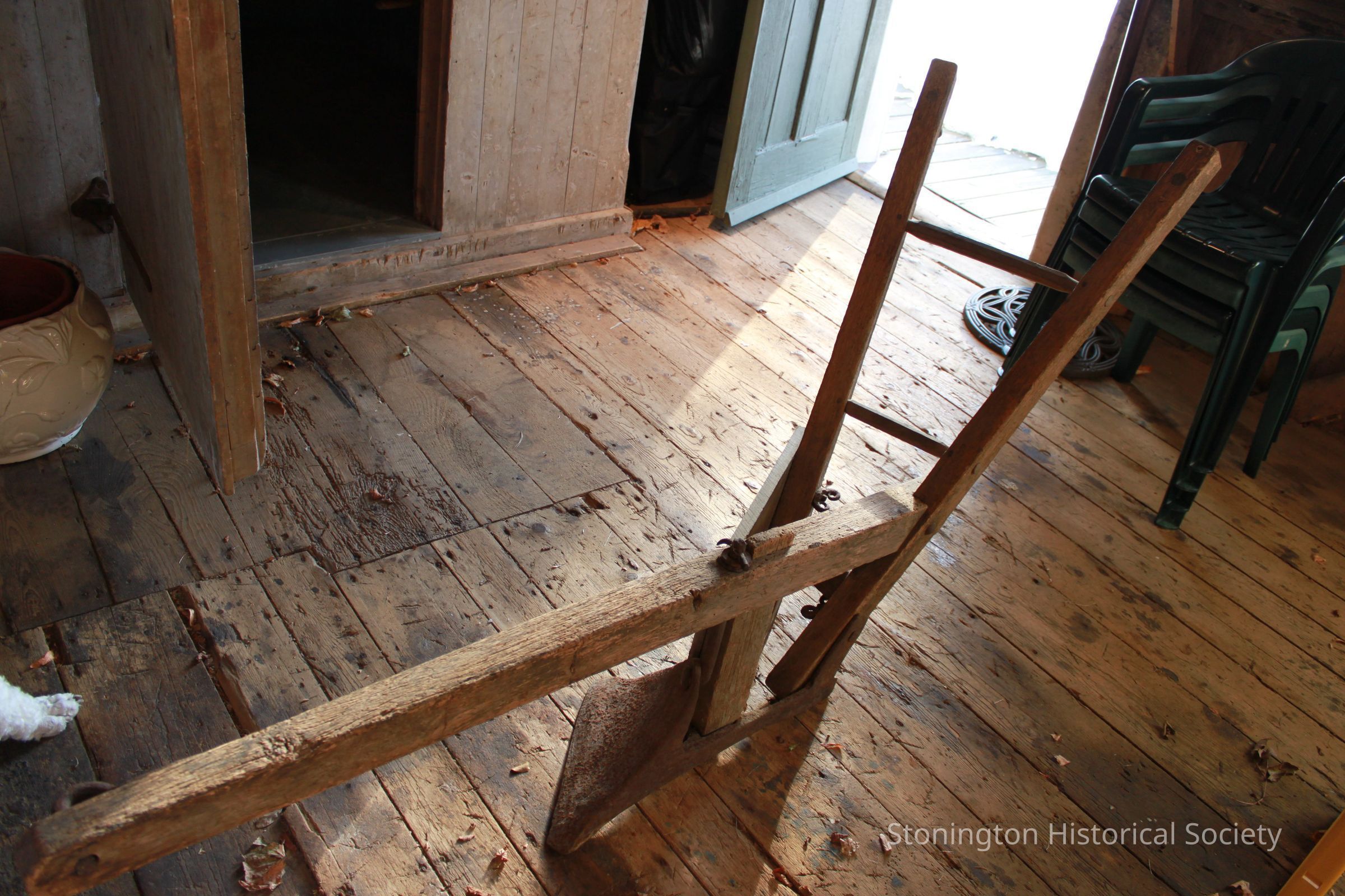 Plow or plough, pre-1814, said to have been left in a field when the farmer pushing it learned that the Stonington Battle of 1814 was taking place.
