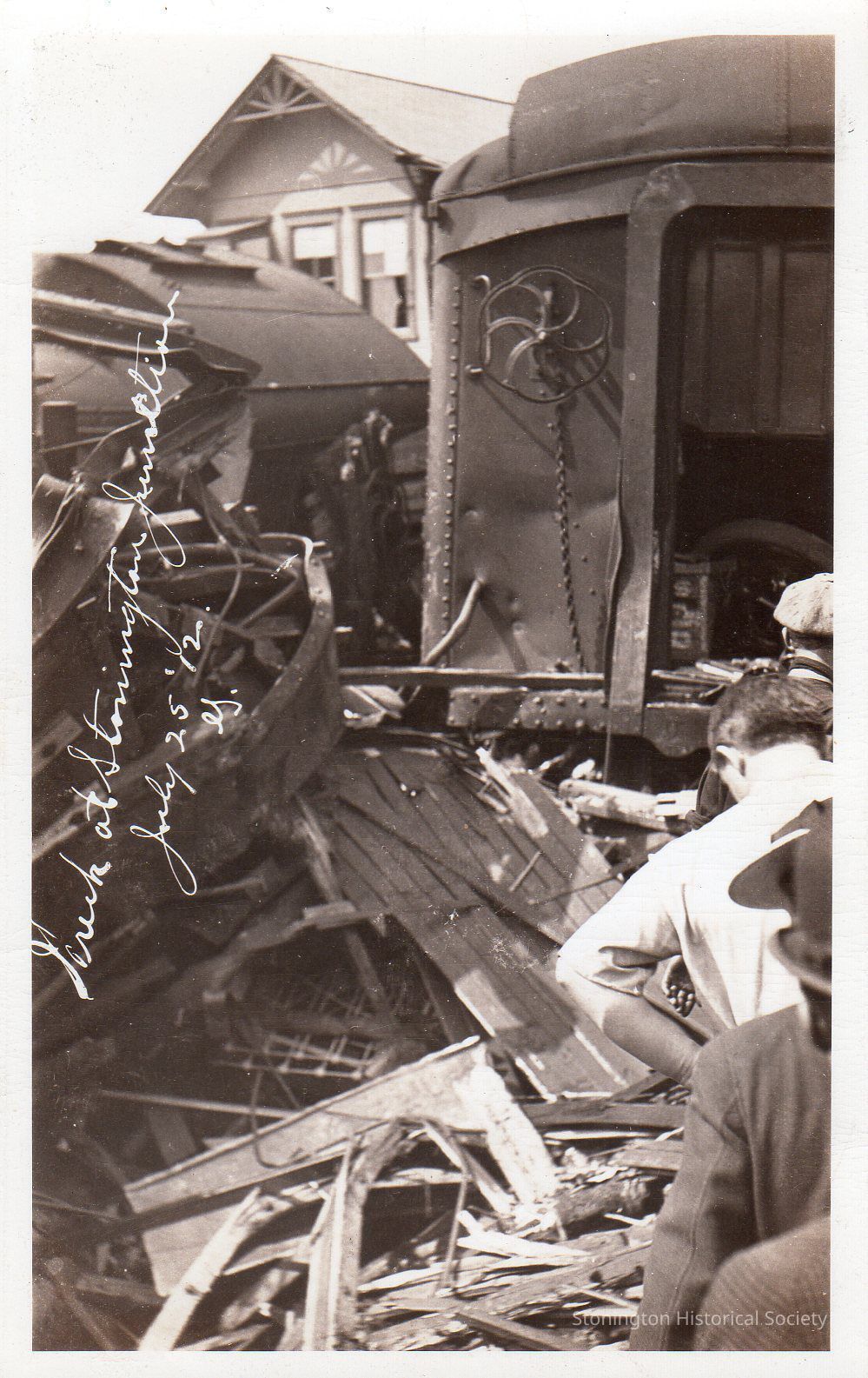 Black and white postcard, photograph of the train wreck at Stonington Junction, July 25, 1912.
