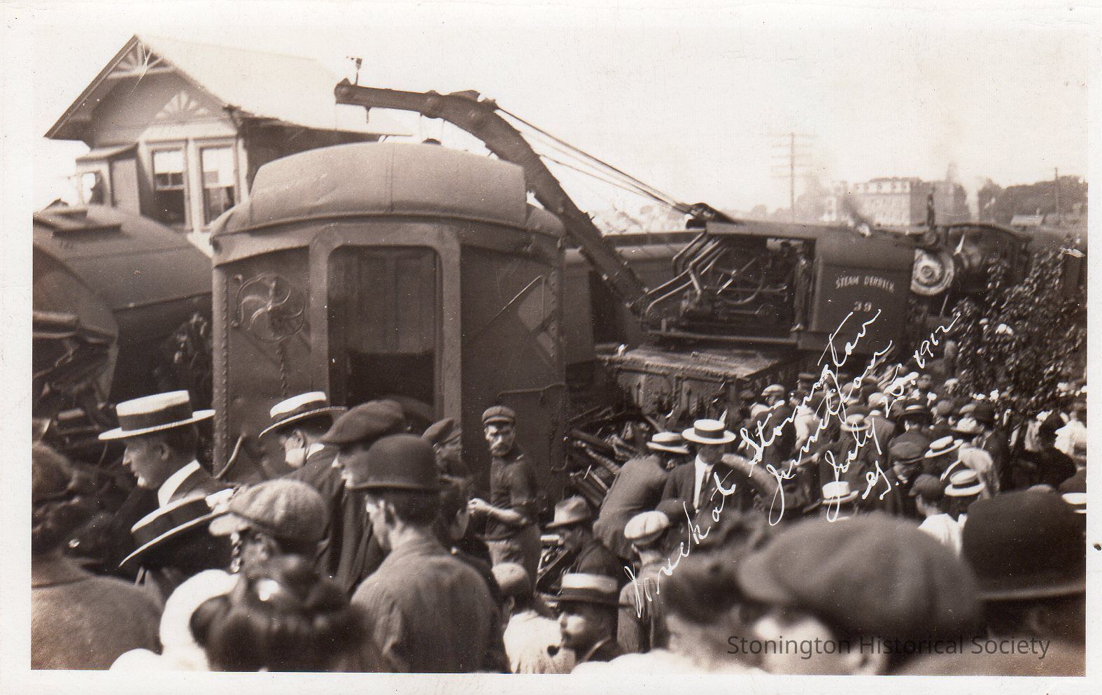 Black and white postcard, photograph of the train wreck at Stonington Junction, July 25, 1912.