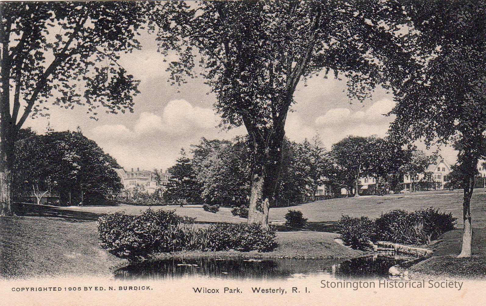 black and white photo postcard, "Wilcox Park, Westerly, R.I." addressed to Miss Mary J. Babcock, from "Amelia" July 27, 1911. Amelia is probably Mary's cousin, Amelia B. Pendleton.