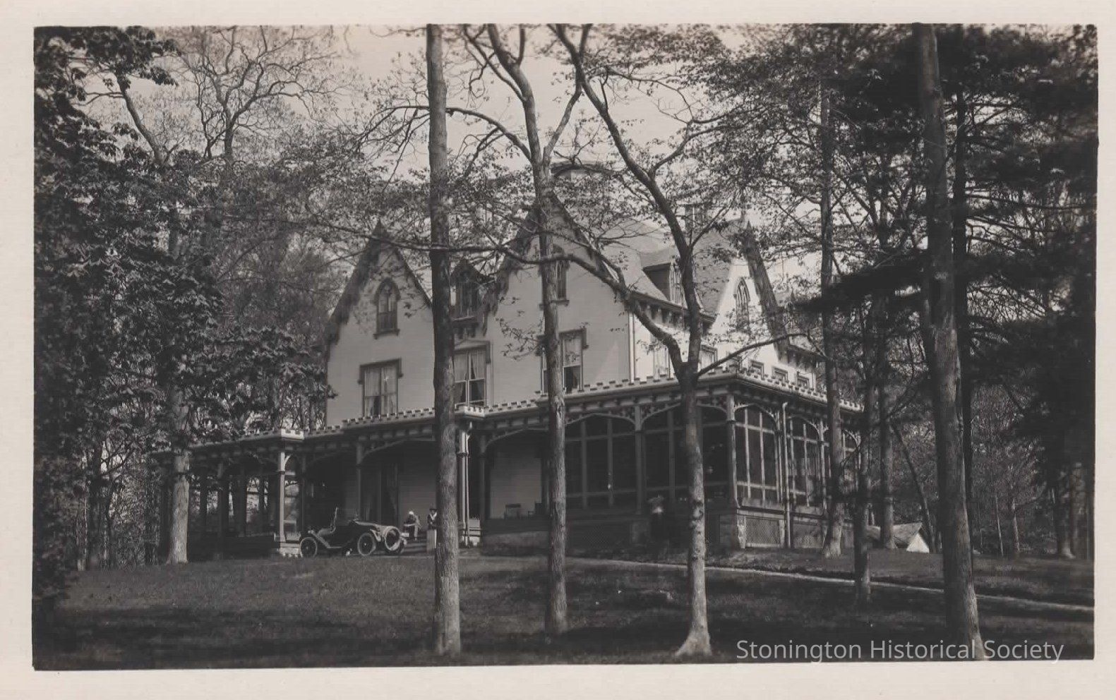 black and white photo postcard of the Manor Inn, Stonington, Conn. This hotel was the site of the former Day home, Walnut Grove. It was sold in 1911 by Thomas Manners of NYC to Mary Eliza and Emmabel Heath and Annette Norton who turned it into the Stonington Manor Inn. The Inn was torn down after the 1938 Hurricane.
