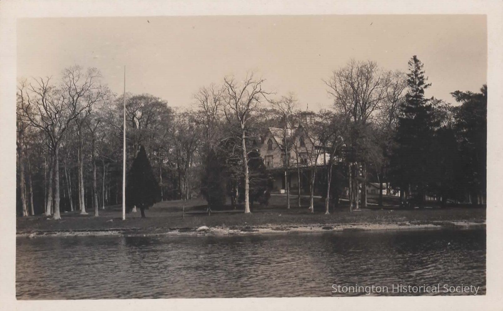 Black and white photo postcard of the bridge at Manor Inn, Stonington, Conn. This hotel was the site of the former Day home, Walnut Grove. It was sold in 1911 by Thomas Manners of NYC to Mary Eliza and Emmabel Heath and Annette Norton who turned it into the Stonington Manor Inn. The Inn was torn down after the 1938 Hurricane.
