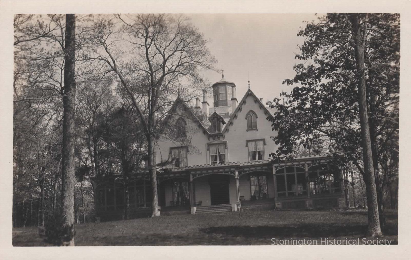 Black and white photo postcard of the Manor Inn, Stonington, Conn. This hotel was the site of the former Day home, Walnut Grove. It was sold in 1911 by Thomas Manners of NYC to Mary Eliza and Emmabel Heath and Annette Norton who turned it into the Stonington Manor Inn. The Inn was torn down after the 1938 Hurricane.