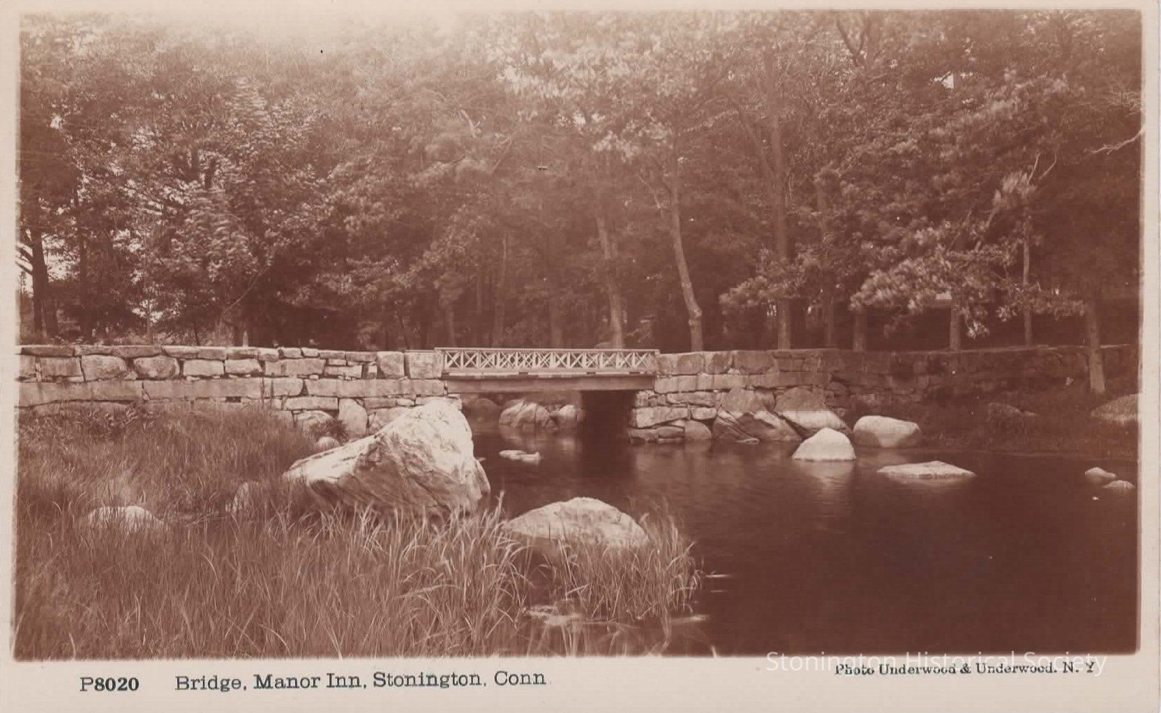Sepia photo postcard of the bridge at Manor Inn, Stonington, Conn. This hotel was the site of the former Day home, Walnut Grove. It was sold in 1911 by Thomas Manners of NYC to Mary Eliza and Emmabel Heath and Annette Norton who turned it into the Stonington Manor Inn. The Inn was torn down after the 1938 Hurricane.