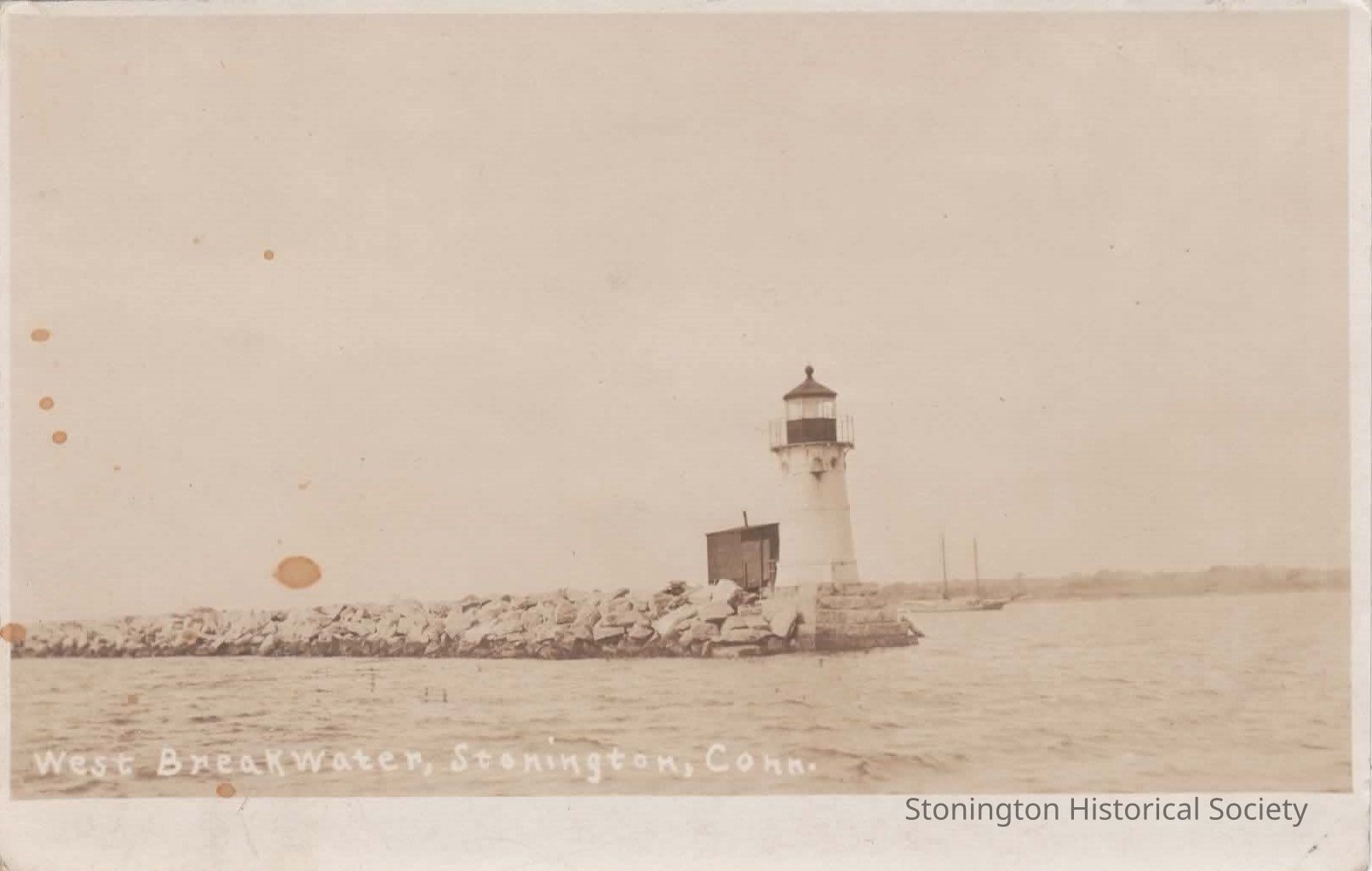 Black and white photo postcard of the "West Breakwater, Stonington, Conn."