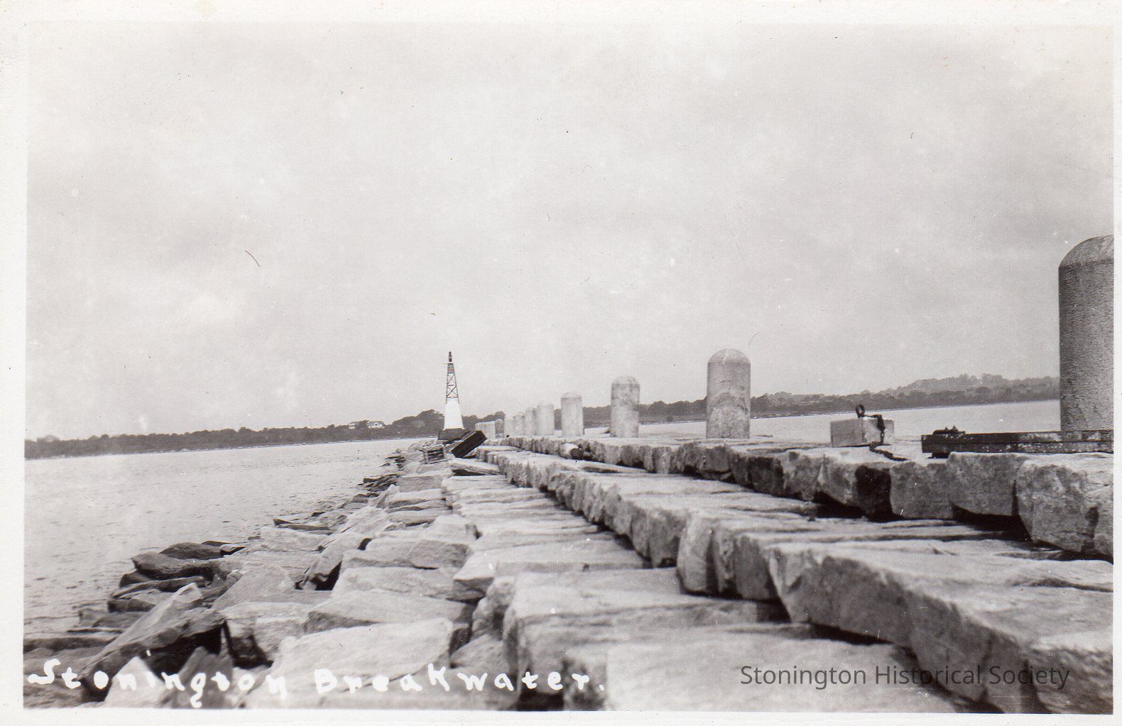Black and white postcard, Stonington breakwater.