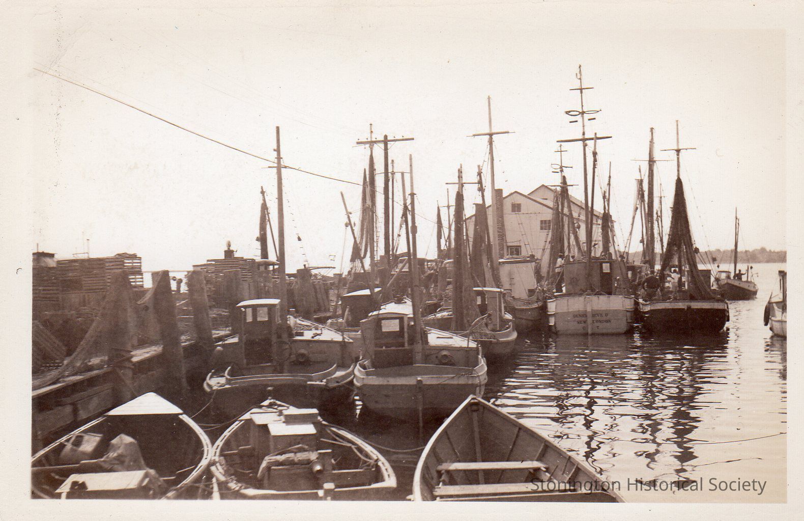 Black and white postcard, fishing boats and trawlers, probably at Bindloss Dock, Stonington.