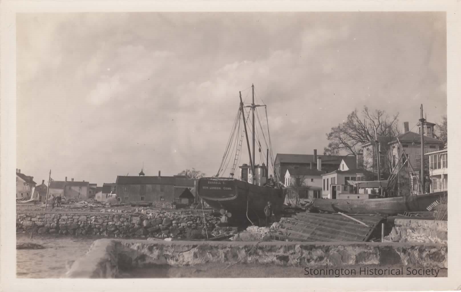 black and white photo postcard of damage from the 1938 Hurricane along the shoreline of Stonington Borough. The RUSSELL S. is seen run aground.