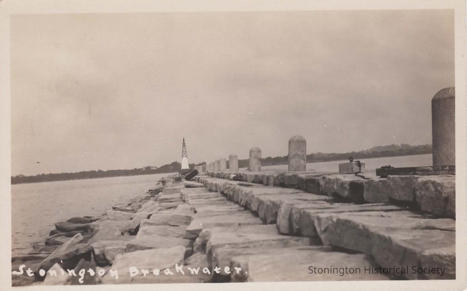 black and white photo postcard of the Stonington Breakwater and breakwater light.