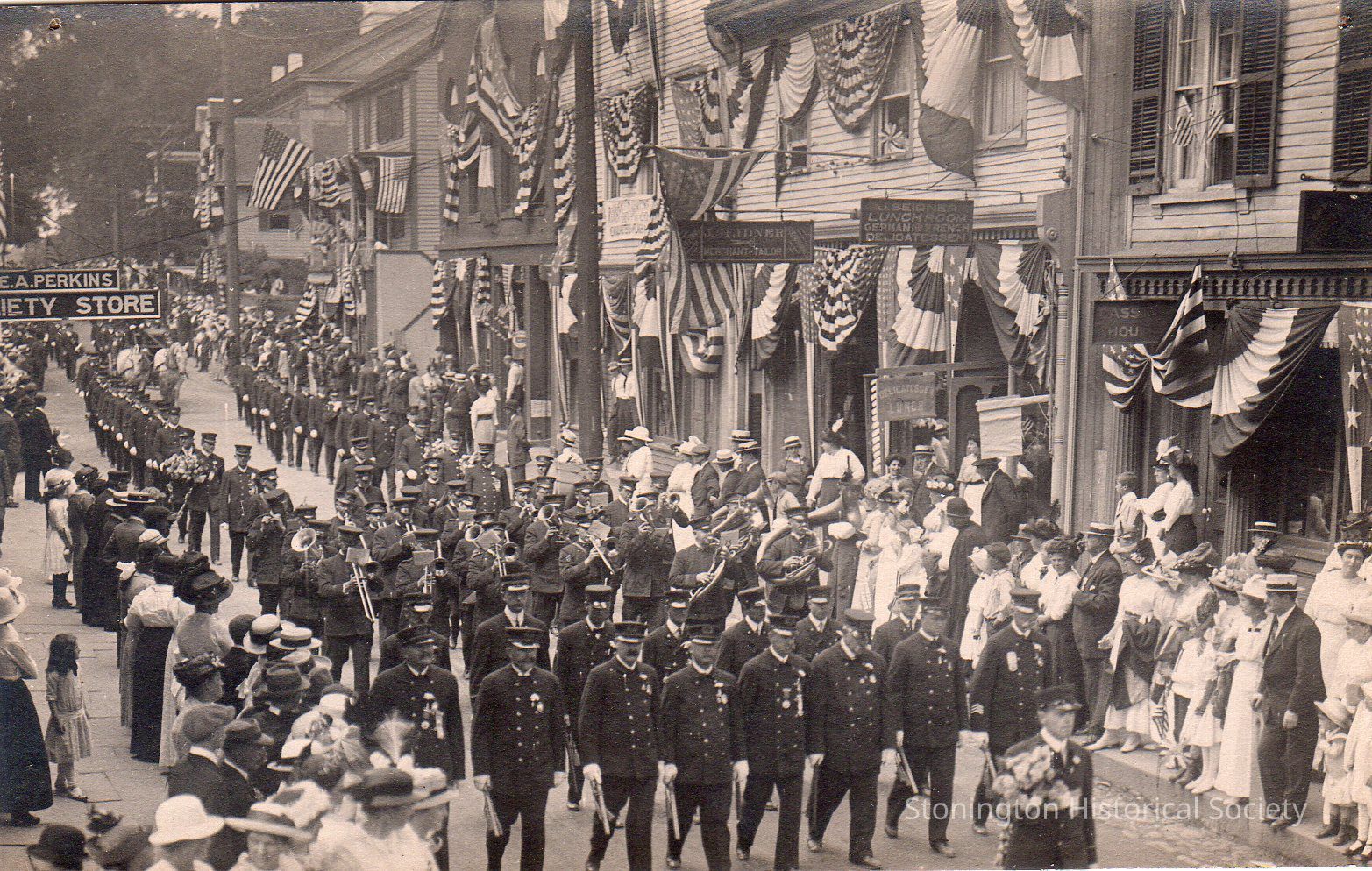 Postcard, black and white photograph of the Battle of 1814 Centennial Parade in Stonington Borough, August 1914.