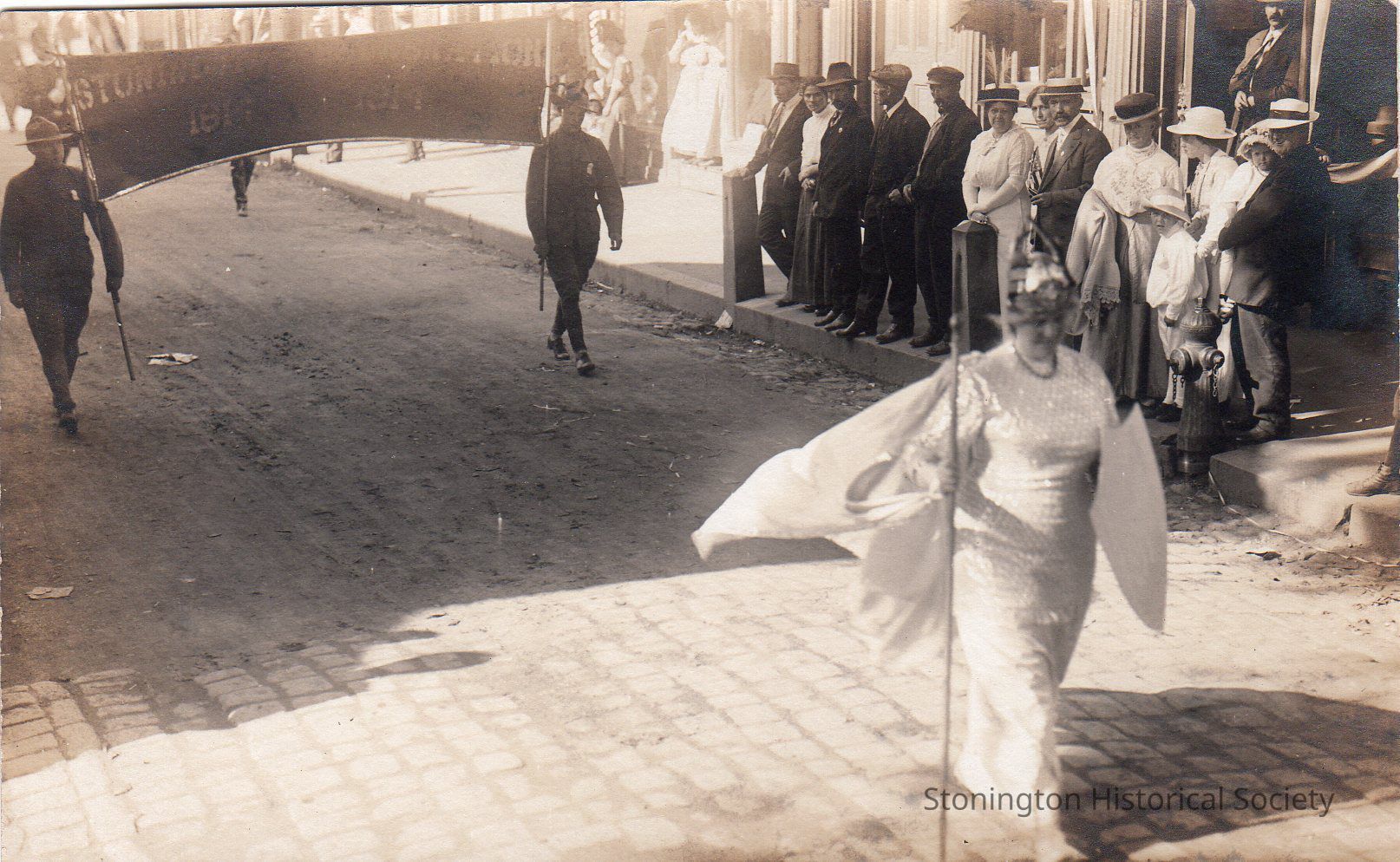 Postcard, black and white photograph of the Battle of 1814 Centennial Parade in Stonington Borough, August 1914. Rieta Babcock Palmer, representing Stonington, marching down Water Street.Collection