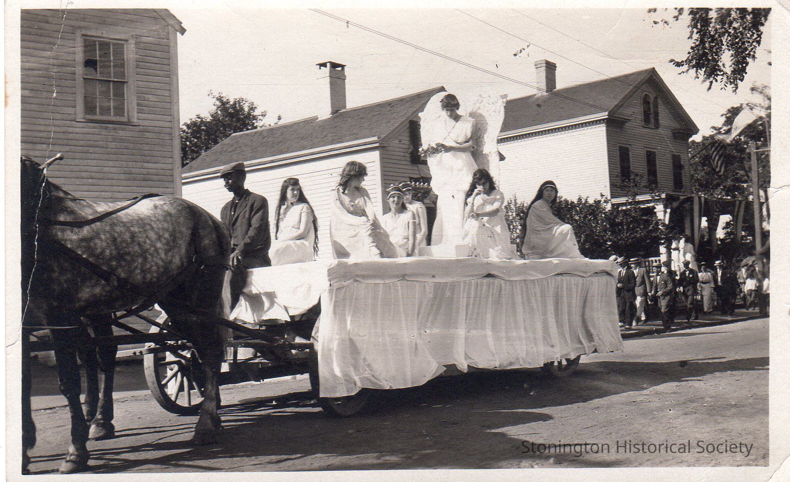 Postcard, black and white photograph of the Battle of 1814 Centennial Parade in Stonington Borough, August 1914. Edith Simmons on the float as Victory.Collection
