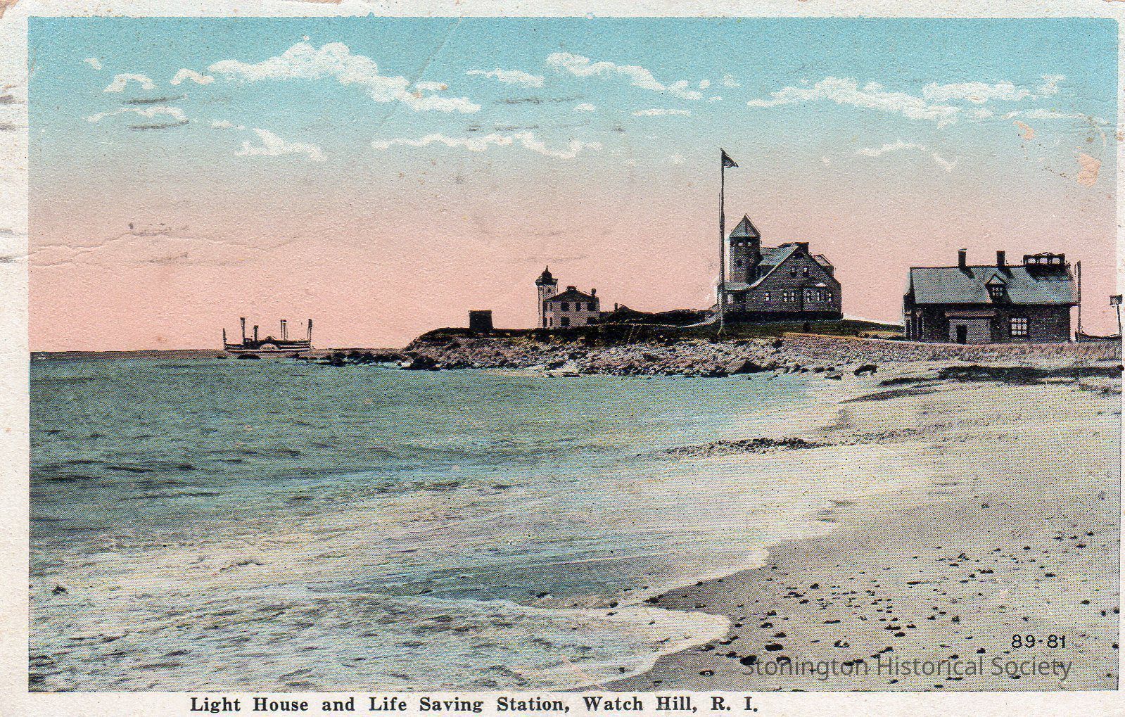 Color postcard, "Lighthouse and Live Saving Station, Watch Hill, RI." Postmarked June 26, 1922.