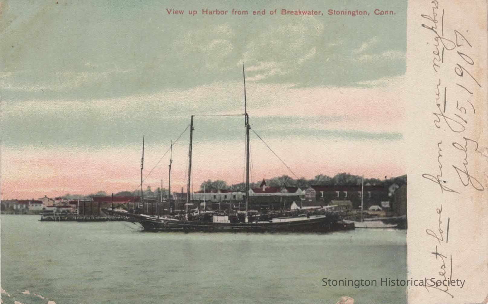color postcard, "View up Harbor from end of Breakwater, Stonington, Conn." addressed to Miss Mary Babcock c/o Mrs. Mattie E. Baker, from "Your Neighbors", postmarked in Stonington, July 15, 1907.