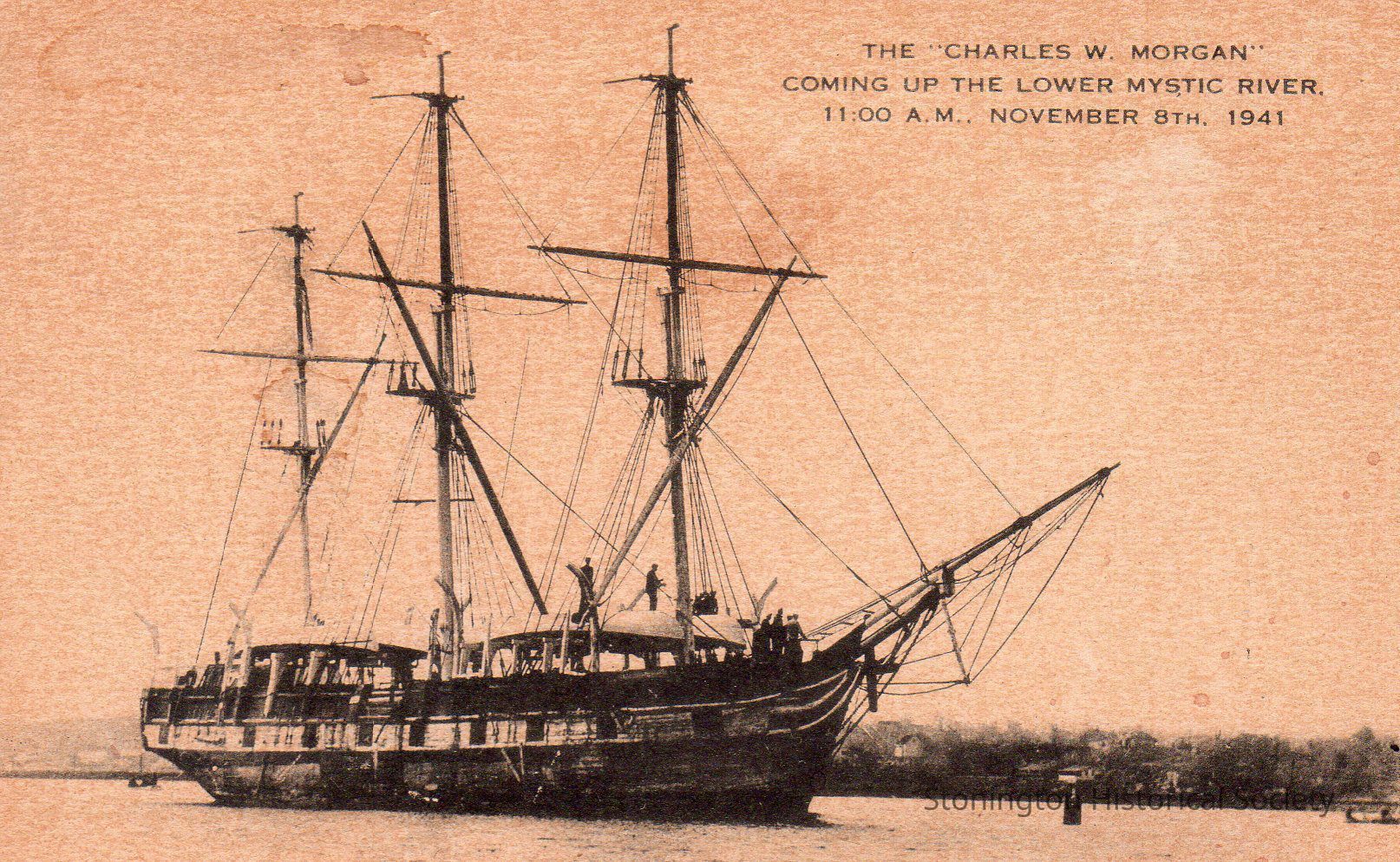 Sepia postcard, "The CHARLES W. MORGAN coming up the lower Mystic River, 11:00 A.M., November 8, 1941." Photograph of the Morgan on her way to Mystic Seaport (then the Marine Historical Association, Inc.).Collection
