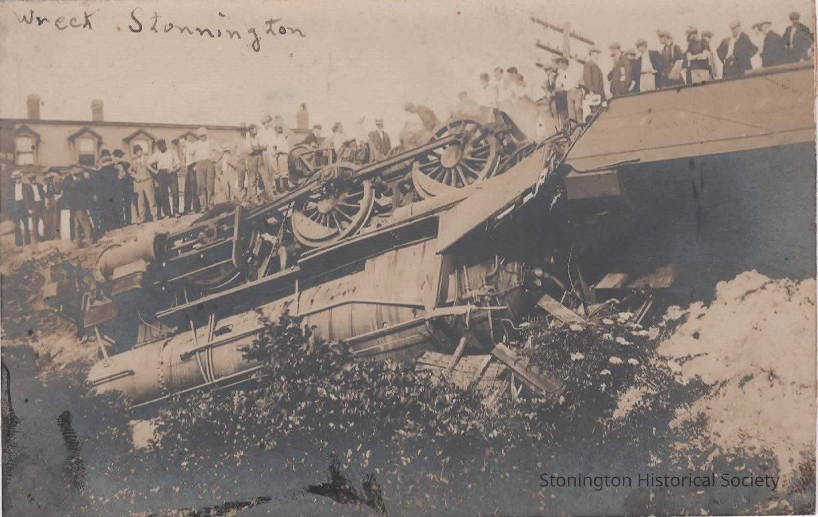 Photo postcard, "wreck - Stonington," picture of the train derailment at Stonington.