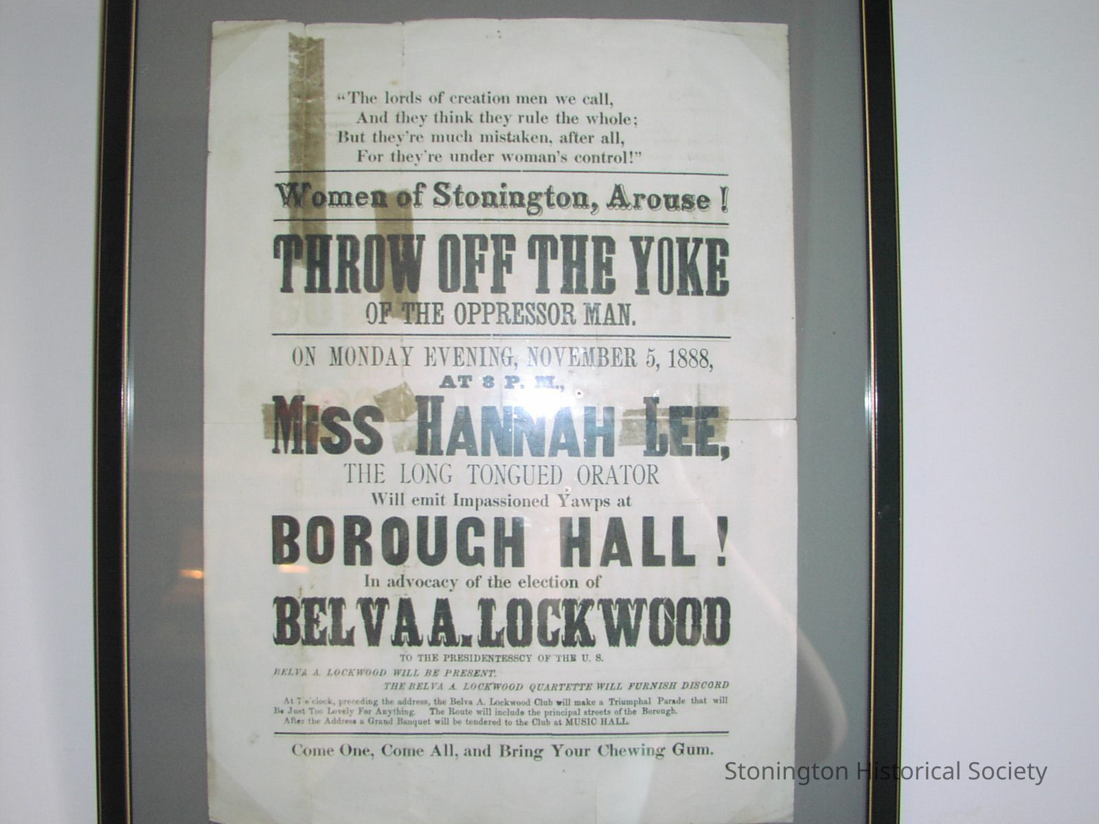 Poster framed under glass advertising an oration by Hannah Lee, advocating Belva A. Lockwood to be elected as president.