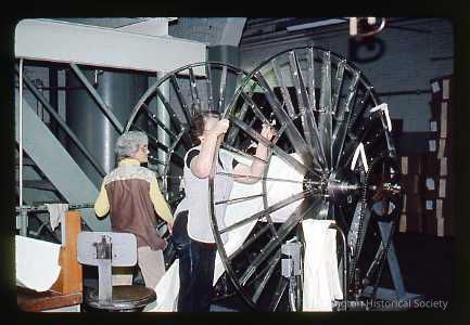 Preparing velvet for dying. Several pieces of velvet are sewn together and then placed on hooks on this large wheel. They are spaced apart so that the velvet doesn't touch. This spinning also provides even dying.Collection