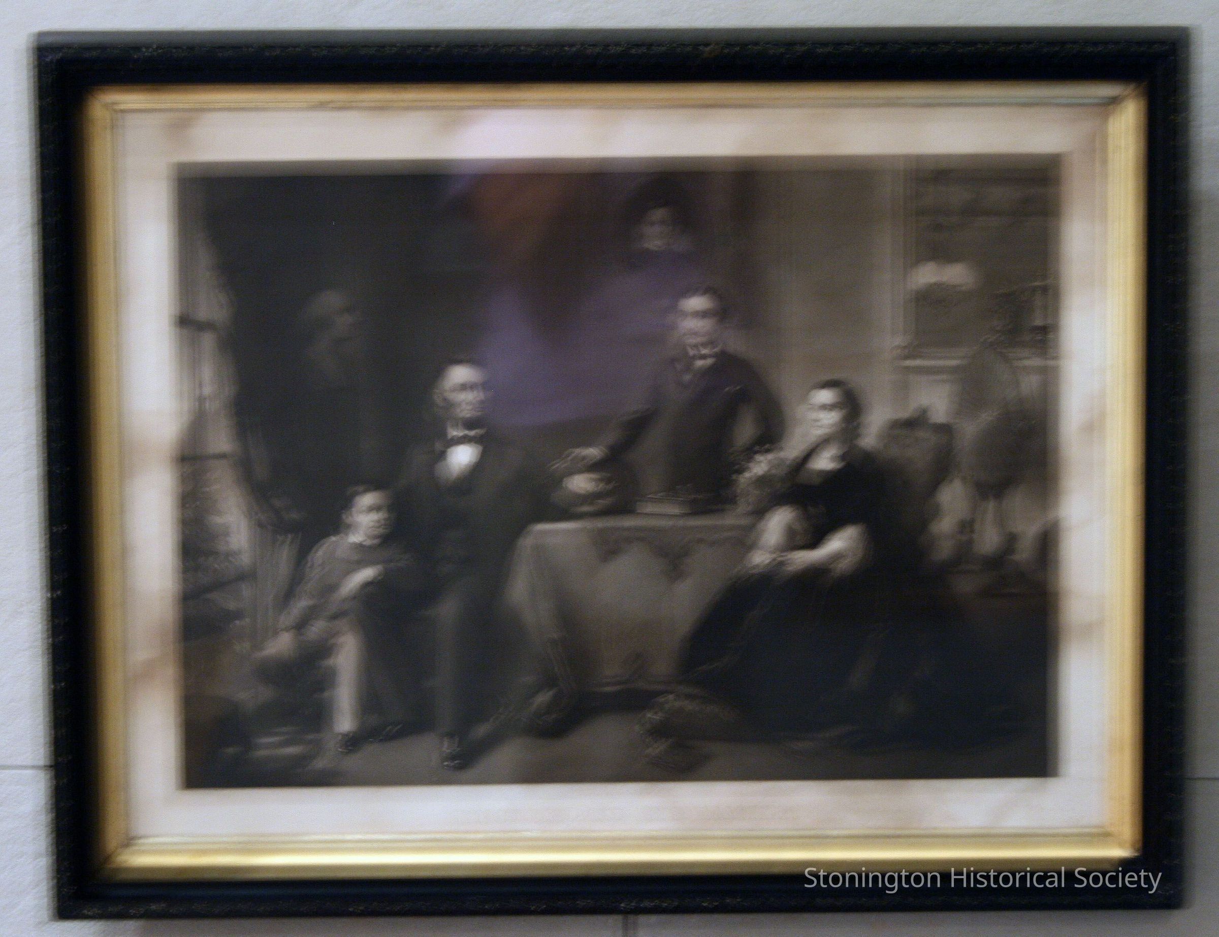 President and Mrs. Lincoln sitting, with sons, Edward (Eddy) Baker and William Wallace standing at oval table. Picture of Robert Todd in background. Also, bust of George Washington on left side.Collection